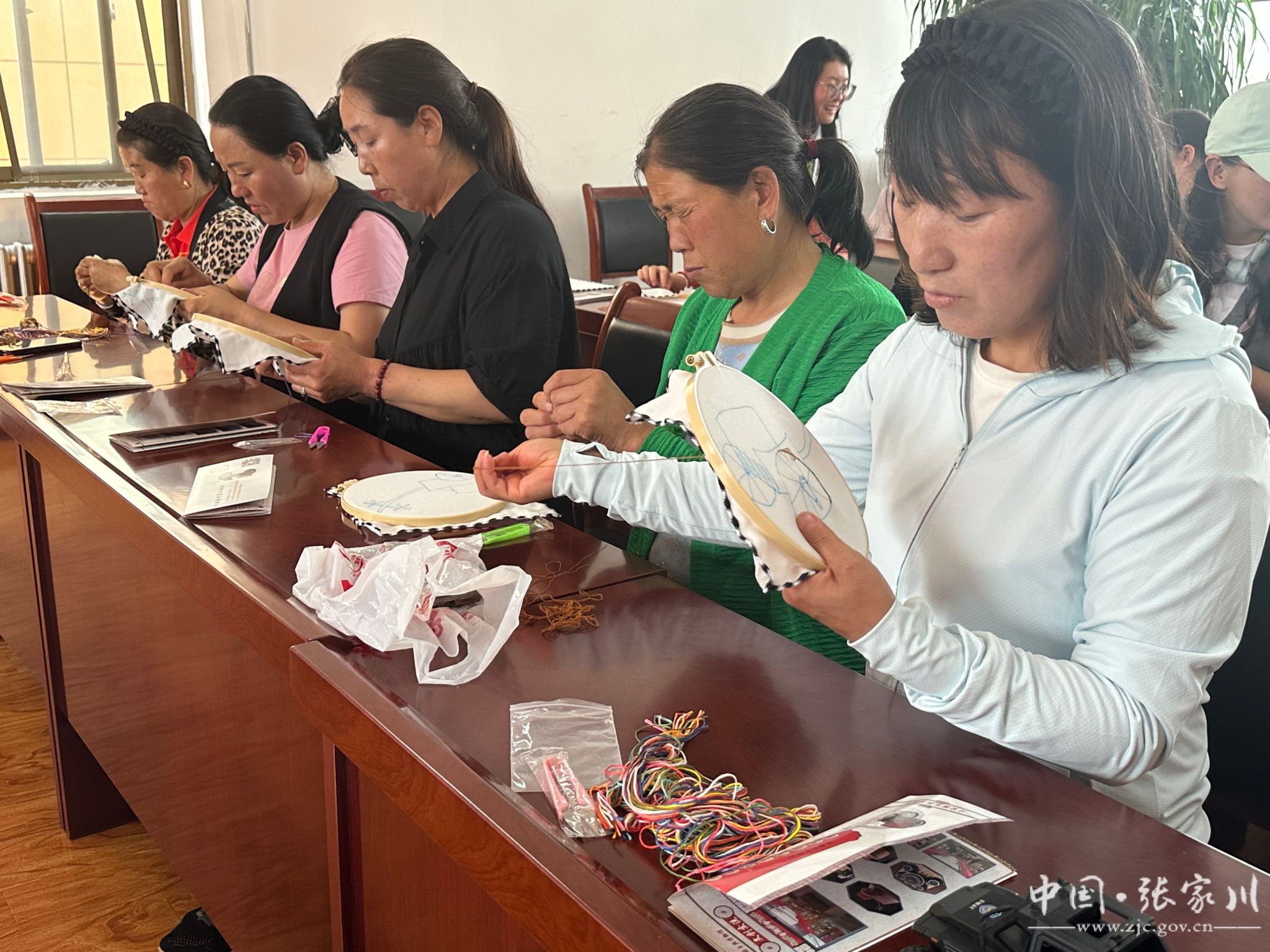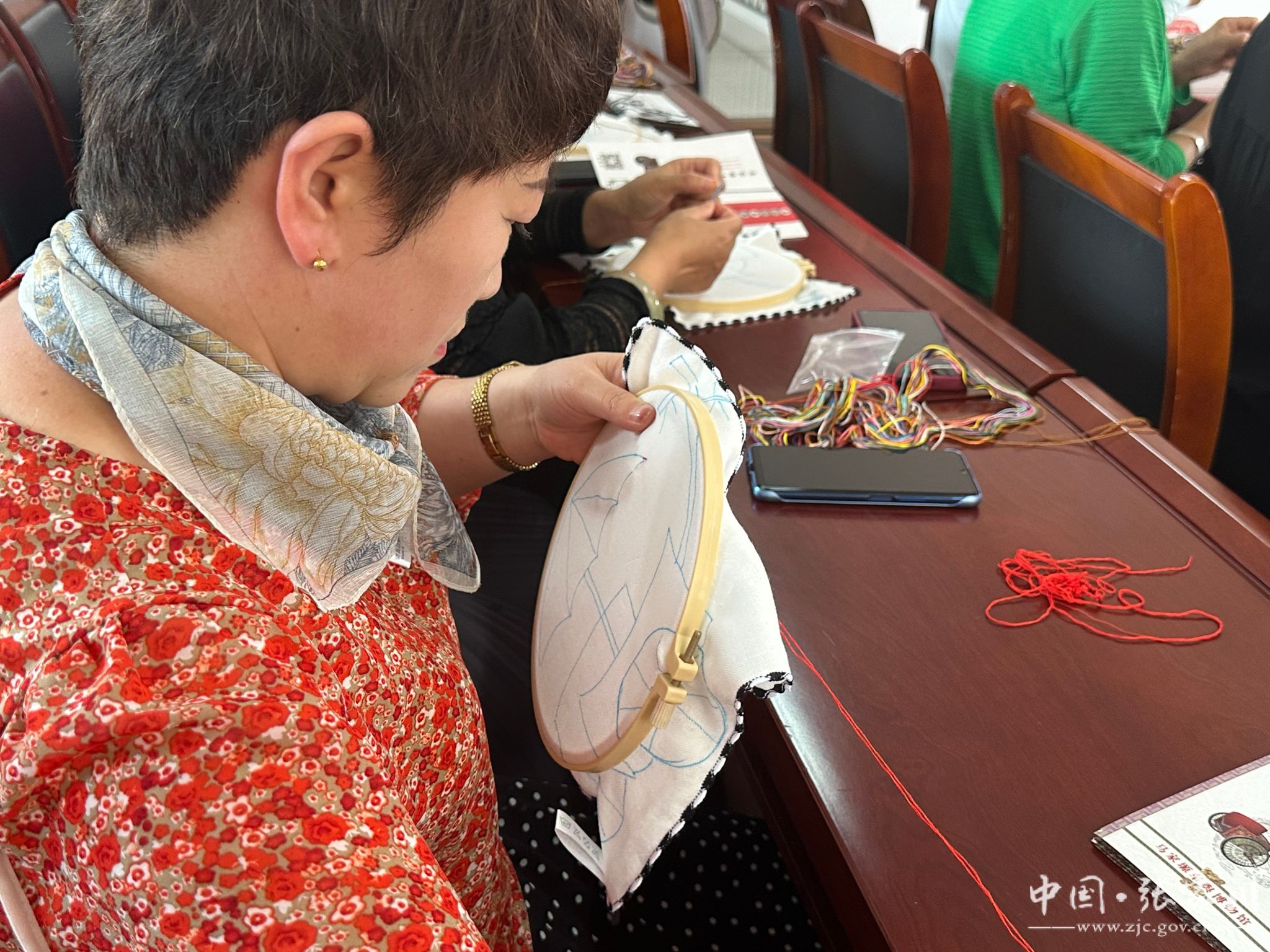 进入手工刺绣环节,在社教老师和志愿者的耐心指导下,社区职工和居民们纷纷拿起针线,动手进行手帕刺绣创作。大家以车舆元素为灵感,一针一线,将对传统文化的喜爱融入到刺绣作品中,现场气氛热烈,居民们相互交流、相互学习,沉浸在传统文化的魅力之中。