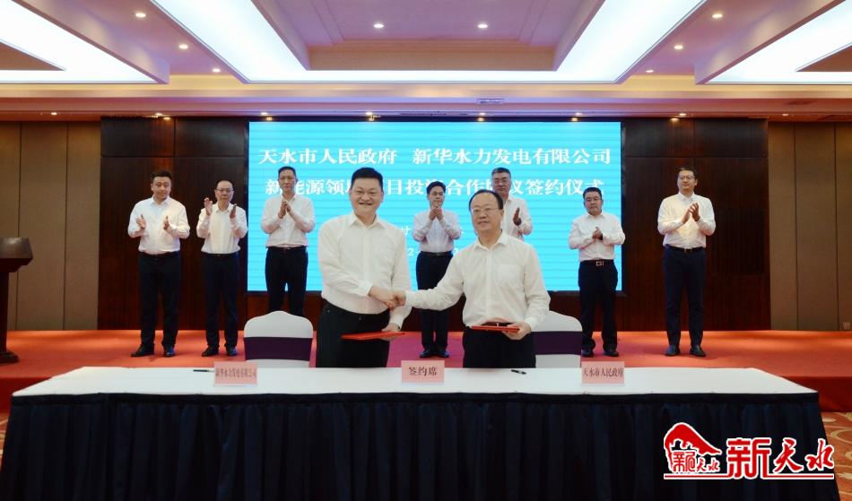 6月23日,天水市人民政府与新华水力发电有限公司签订新能源领域投资合作协议。市委副书记、市长王国先,新华水力发电有限公司党委书记、董事长张焰出席签约仪式并分别致辞。市委常委、常务副市长贾义翔主持签约仪式并代表天水市政府与新华水力发电有限公司签订了《新能源领域项目投资合作协议》。
