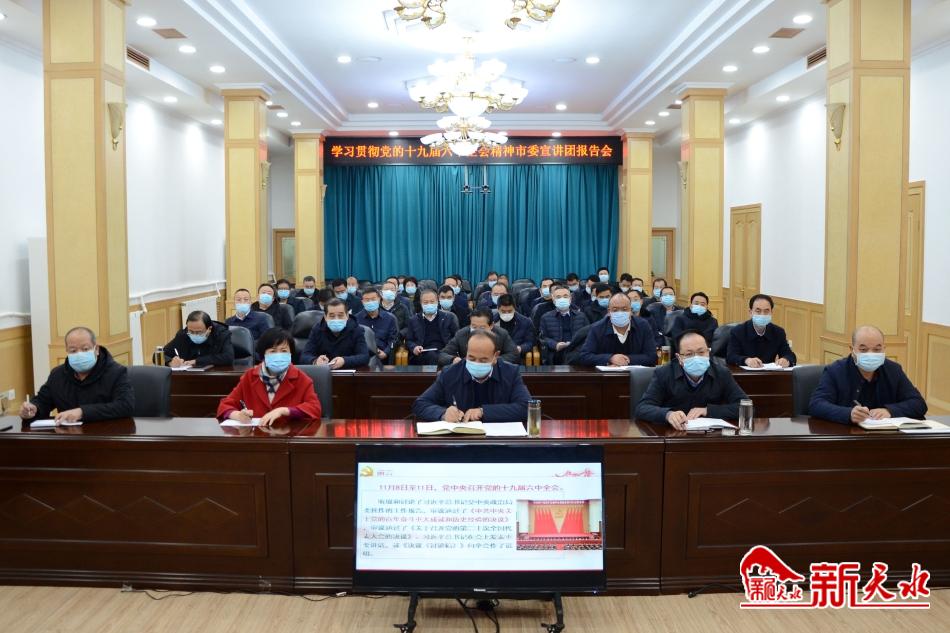 1月5日,天水市委副书记、市长王国先在市政府系统宣讲党的十九届六中全会精神。他强调,全市政府系统要深入学习贯彻党的十九届六中全会精神,全面落实中央和省委、省政府决策部署,按照市第八次党代会确定的目标定位,在党史中汲取智慧和力量,在学习中坚定信仰和信念,在奋进中牢记初心和使命,把全会精神转化为奋进新征程、建功新时代的强大动力,以更加扎实有效的措施抓好政府各项工作,努力谱写建设幸福美好新天水的崭新篇章。