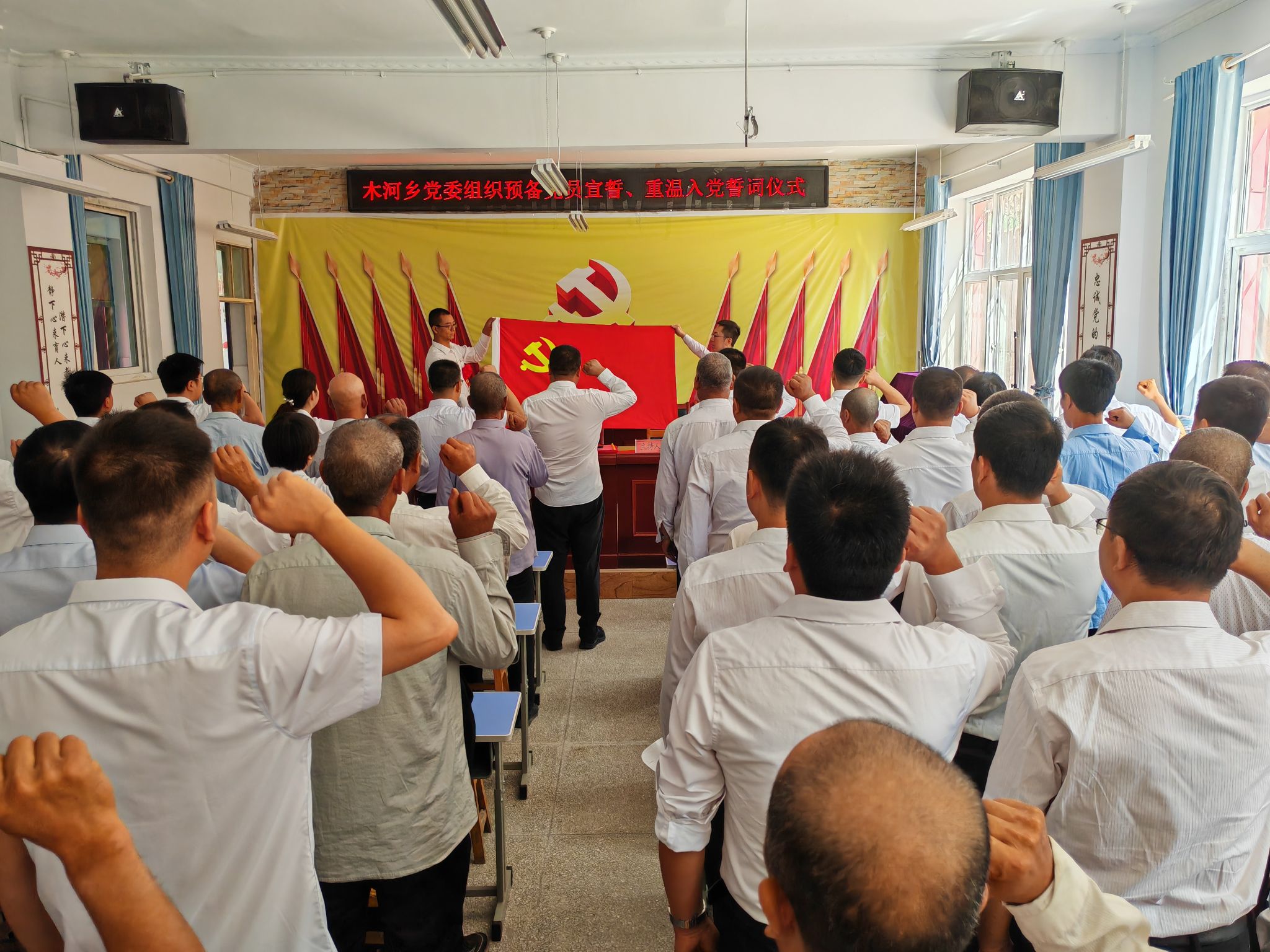 回顾党的光辉历程,弘扬伟大建党精神,强化党员宗旨意识,激发党员使命感和责任感,木河乡组织2名预备党员入党宣誓,组织全体到会党员和6名转正党员开展庆“七一”重温入党誓词活动。