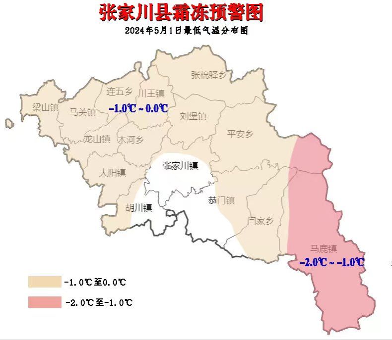 预计5月1日清晨,张家川县1700米以上高海拔山区温度预计下降到-1~0℃,有轻霜冻风险;1日夜间~3日有阴雨天气,对正处于坐果至幼果膨大生长期的果树及设施农业将造成不利影响,需提前采取防护措施。