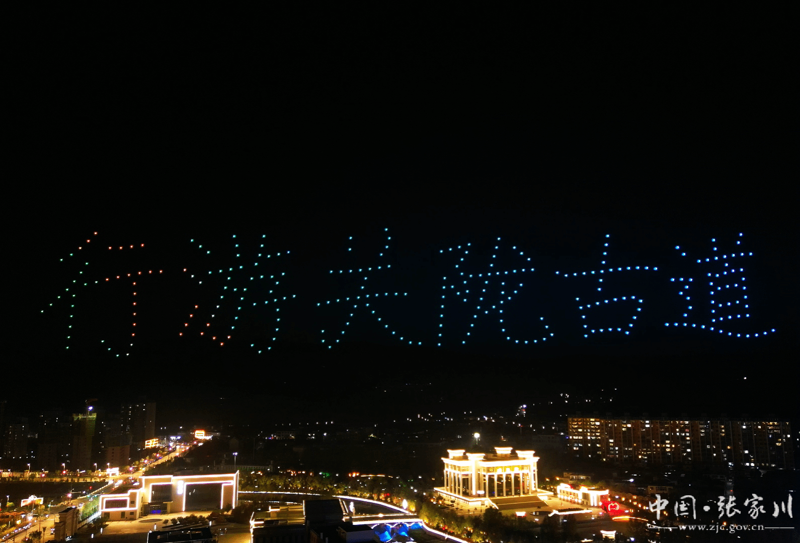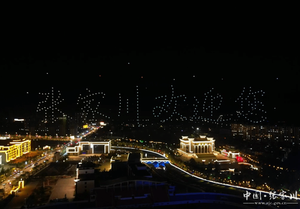 升空后的无人机开始变换阵形,色彩斑斓的灯光变化与张家川的夜景相融交织,让人们感受到了科技与艺术的完美结合。“丝路大关山”、“书香张家川”、“行游关陇古道”、“打卡战国豪车”、“品天水麻辣烫”、“游丝路张家川”、“花儿张家川”、“丝路张家川”等张家川元素随着光影变化,在星空中一一呈现。最后,充满了热情和亲切感的“张家川欢迎您”字样闪耀在夜空中,表达了张家川人民对来自四面八方游客的热烈欢迎。每次光影变换之间,都有新的惊喜,视觉效果拉满!