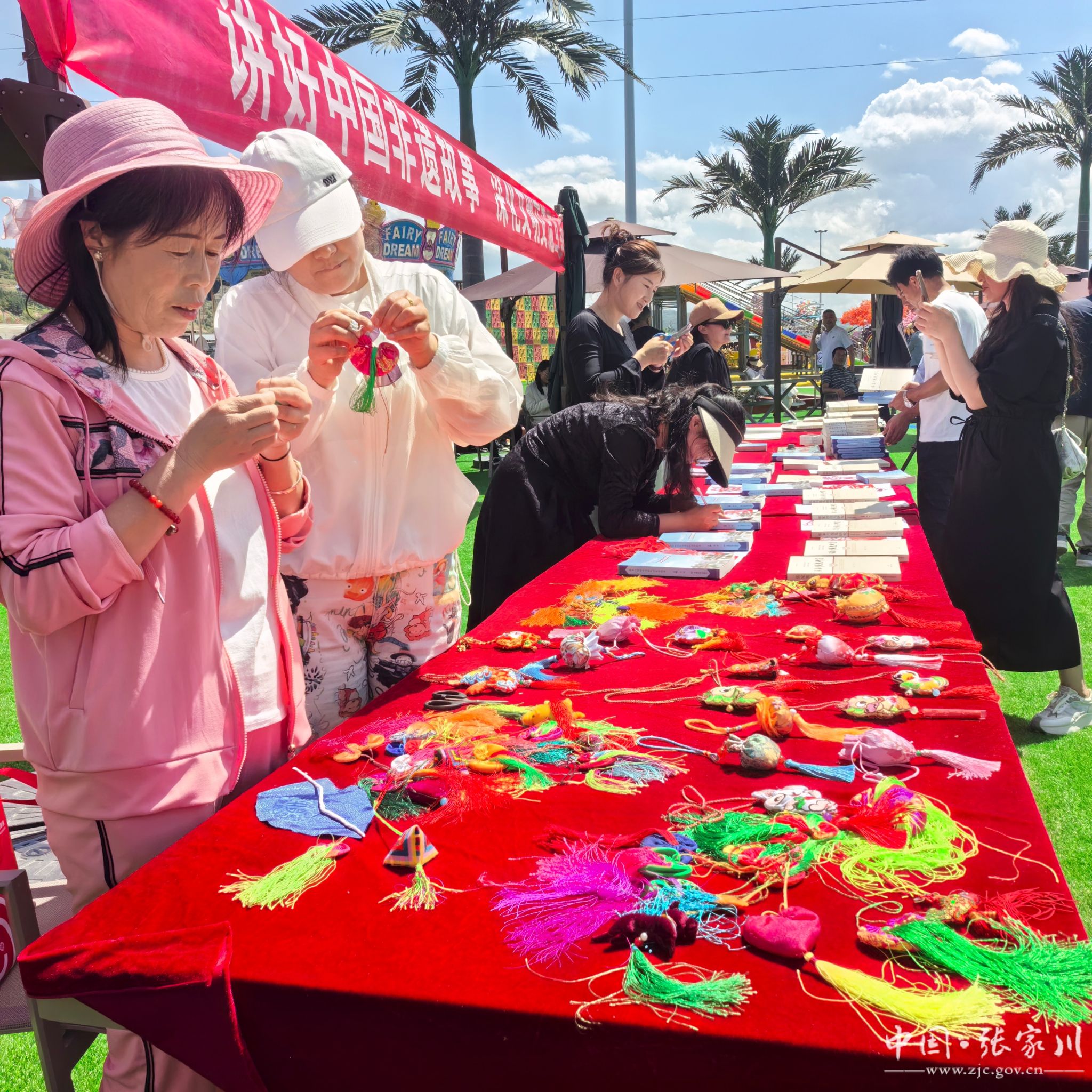 “我们的节日⋅端午”荷包制作展示更是引人瞩目,展台上摆放着各式各样的荷包材料,五彩斑斓的丝线,精美的布料,手工艺大姐用娴熟的手法将一根根丝线编成精美的荷包。在场的观众感受着传统文化的魅力。