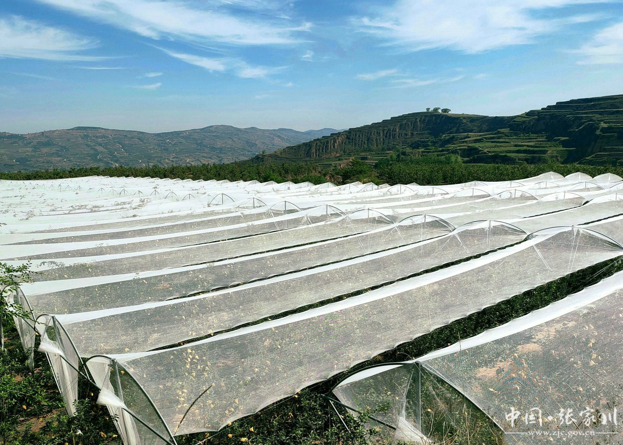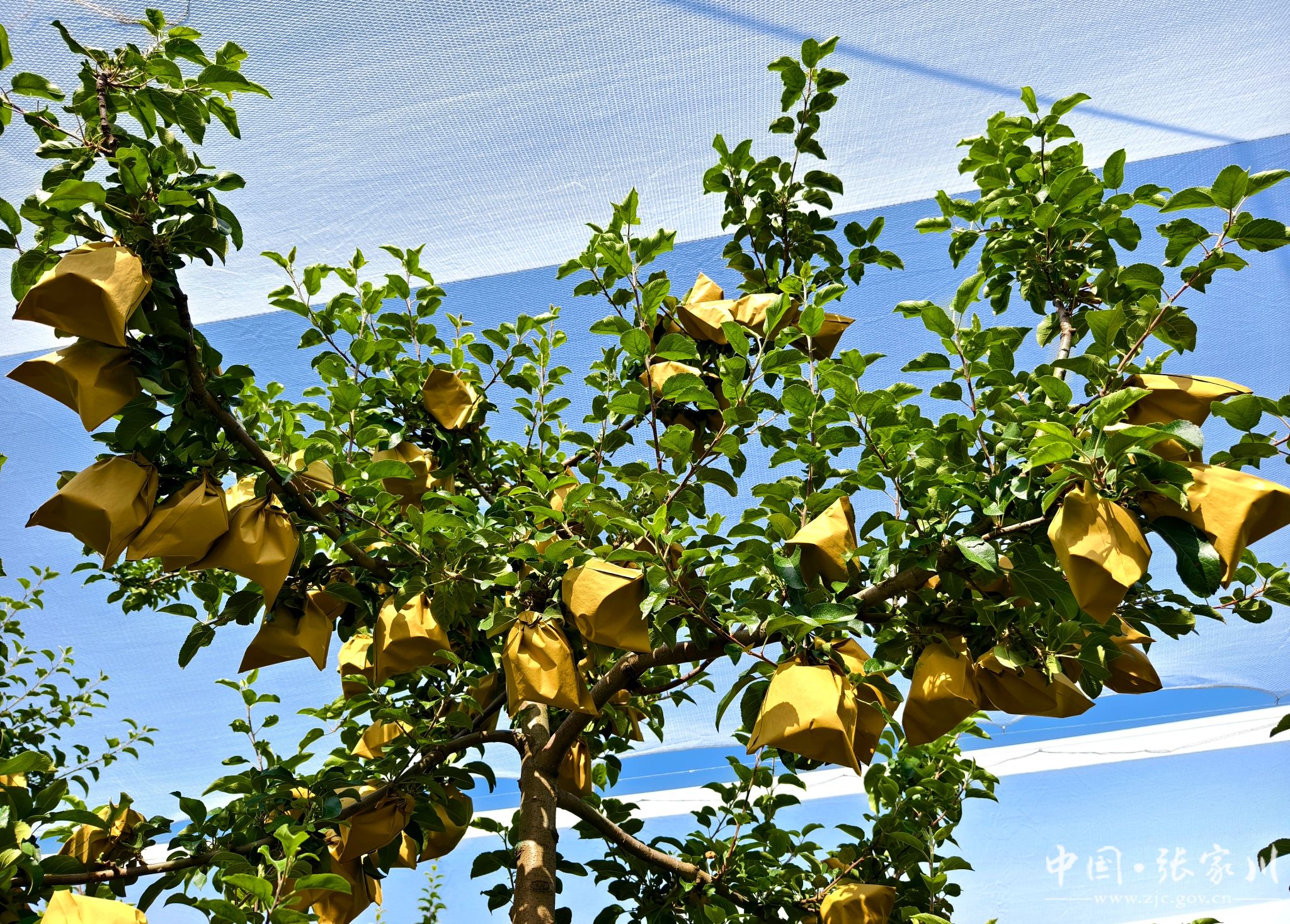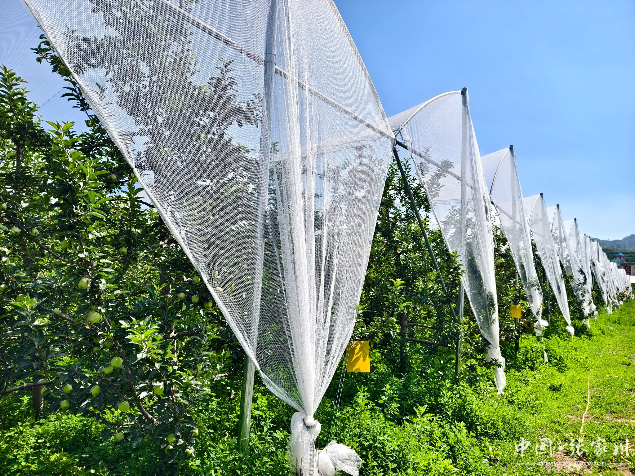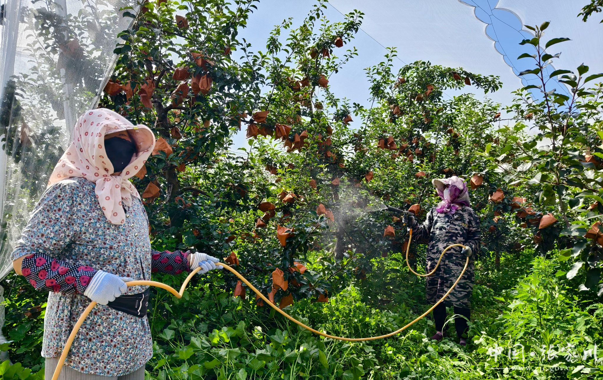 在木河乡庄河村的隆裕家庭农场的苹果园,白色防雹网下数千棵苹果树郁郁葱葱,枝丫上乒乓球般大小的幼果均匀分布,不套袋的花牛苹果青绿喜人,已套袋的富士苹果穿上了土黄色的新衣,果园管护人员正在给果树喷药,以提高果实品质。