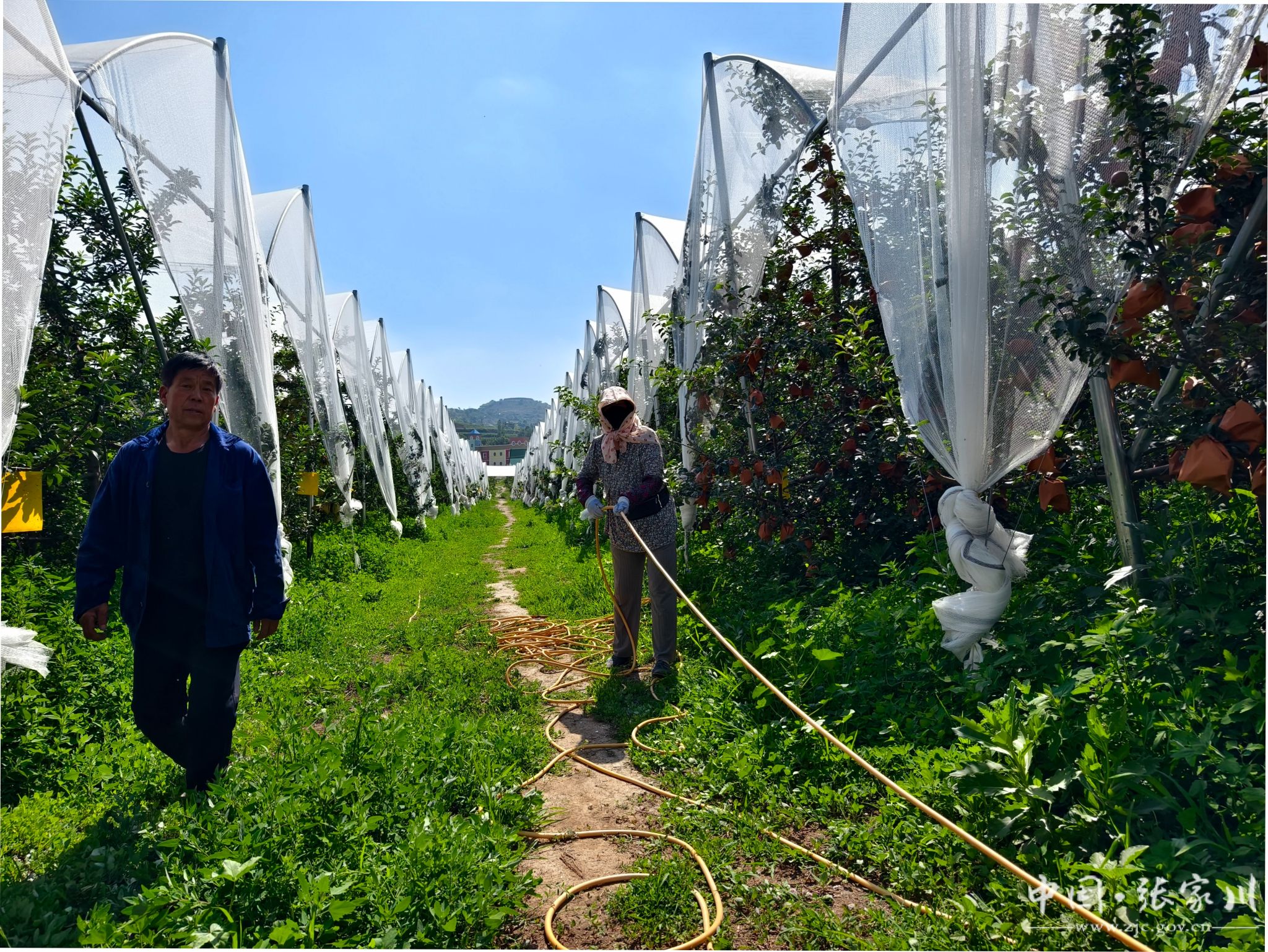 在梁山镇樱桃沟村的西瓜园内,村党支部书记马五平带领种植能手了解西瓜的生长情况,几人仔细查看瓜田,不时从瓜藤上清理出长歪的劣果。在苹果园中,果农们穿梭在树影中,忙着给果树施肥,一派繁忙的景象。夏季气温高,正是各种水果谢花出果的好时候,果园的技术管护也需要比平时更加仔细。