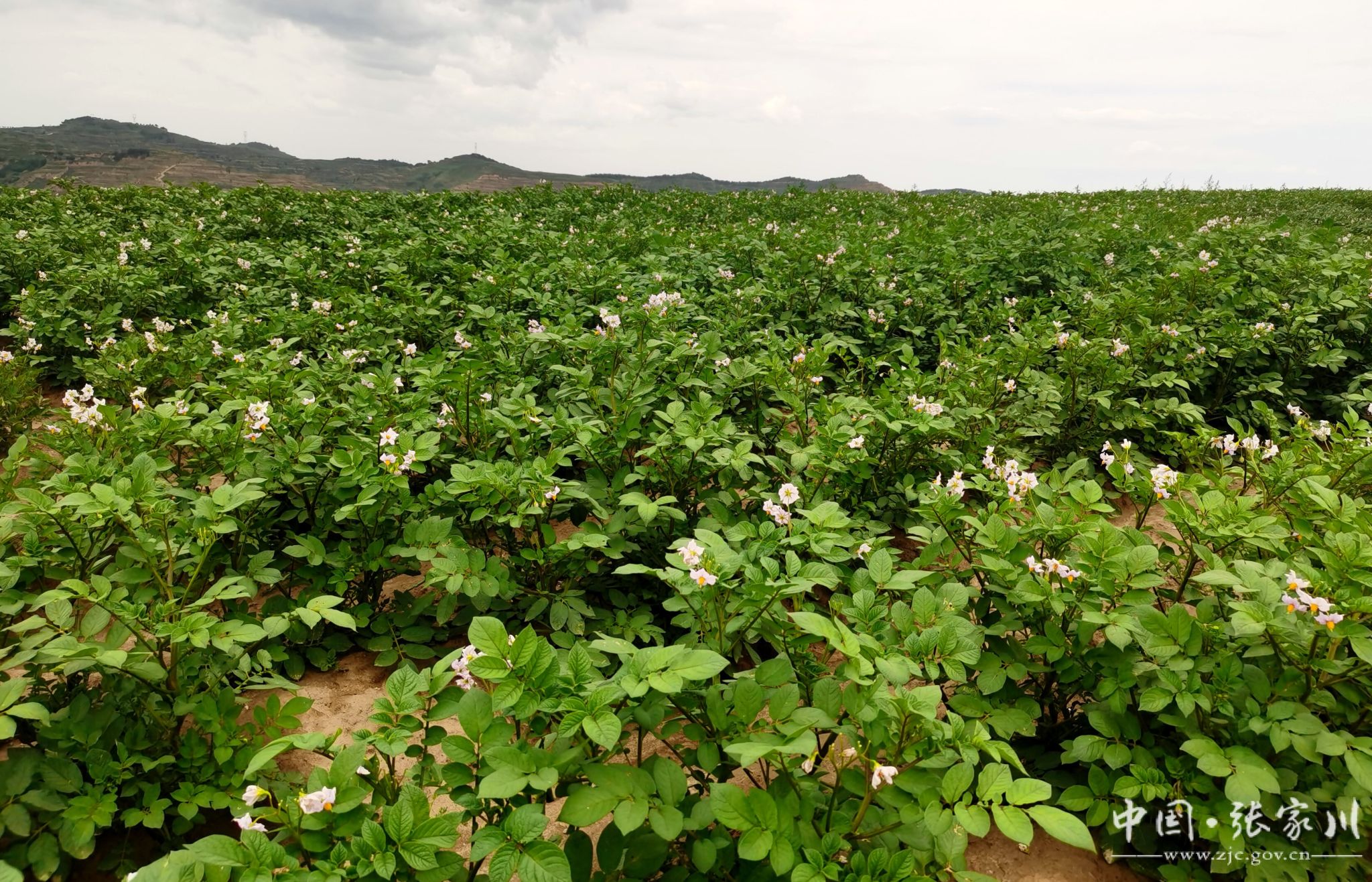 日前,记者在川王镇海湾村的山顶看到,山下万亩马铃薯示范基地一望无垠,马铃薯花开正旺,粉白色的花朵随风摇曳,形成了一片花的海洋。