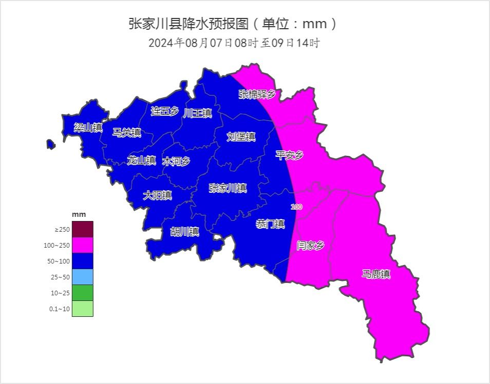 预计8月7~9日,张家川县有一次大范围强降水天气过程,量级以大到暴雨为主,东部乡镇大暴雨。主要降水时段在8日下午至夜间,累积雨量80~130毫米,个别乡镇最大可达130~180毫米;最大小时雨强40~70毫米。7月以来我县已出现3场区域性暴雨,此次降水与前期降水落区叠加,需防范强降水可能引发的滑坡、崩塌、山洪等次生灾害。