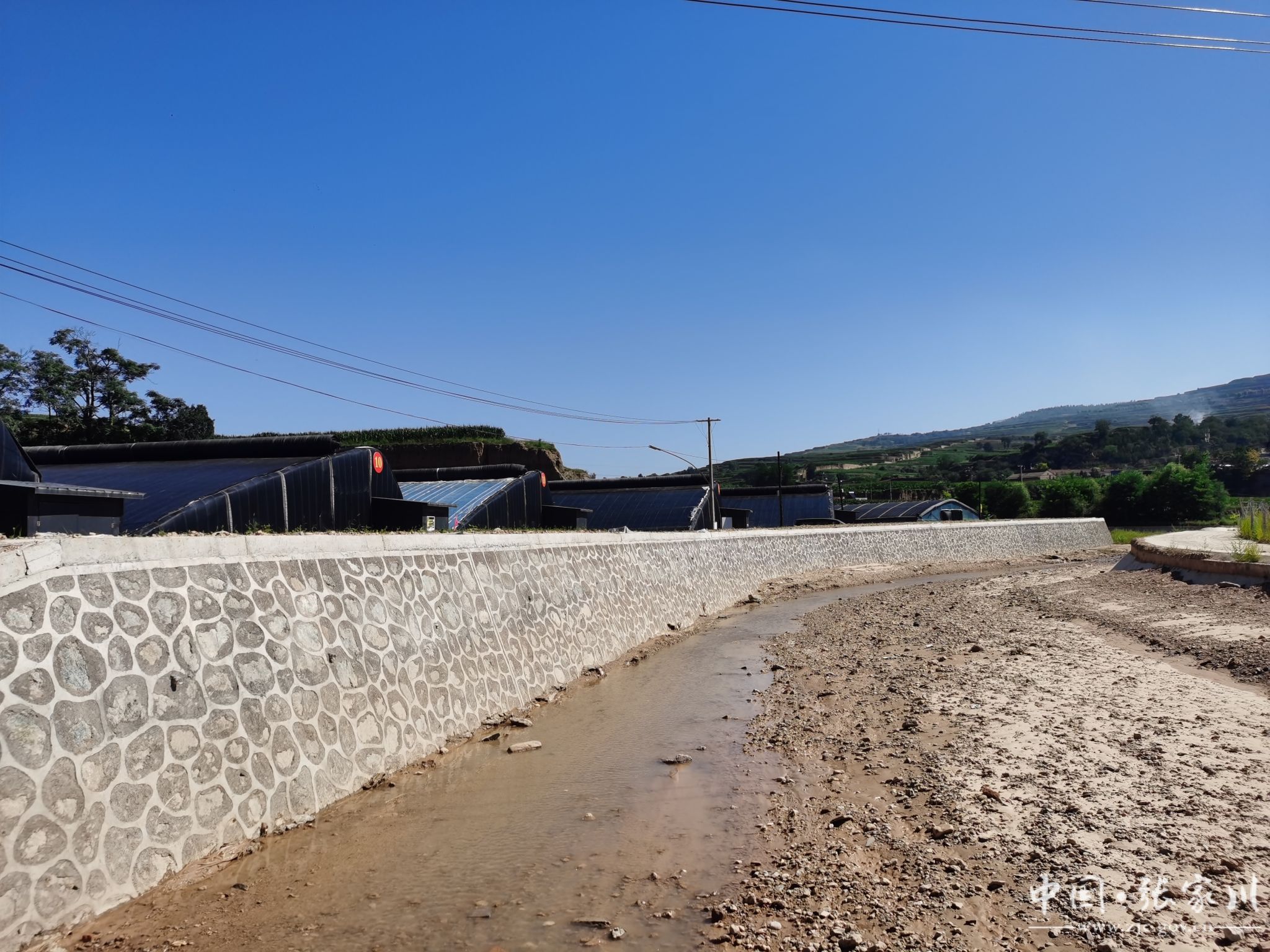 8月12日,记者在张家川县马关镇石川村新建堤防现场看到,清澈见底的河水在堤防内缓缓流过,河岸两侧的西部蔬菜产业园的大棚依次排列,棚内的蔬菜瓜果飘香。