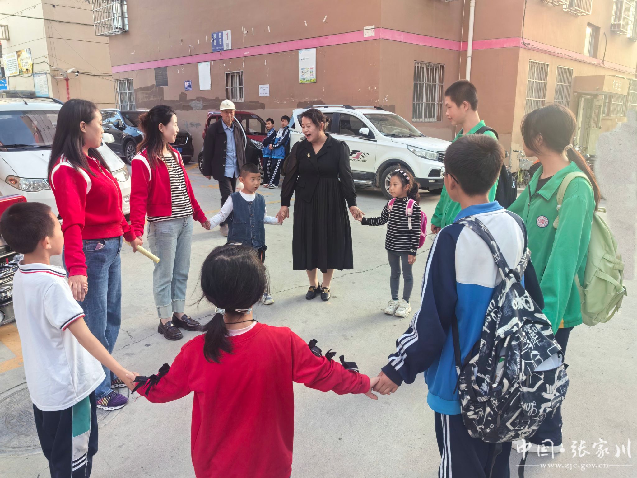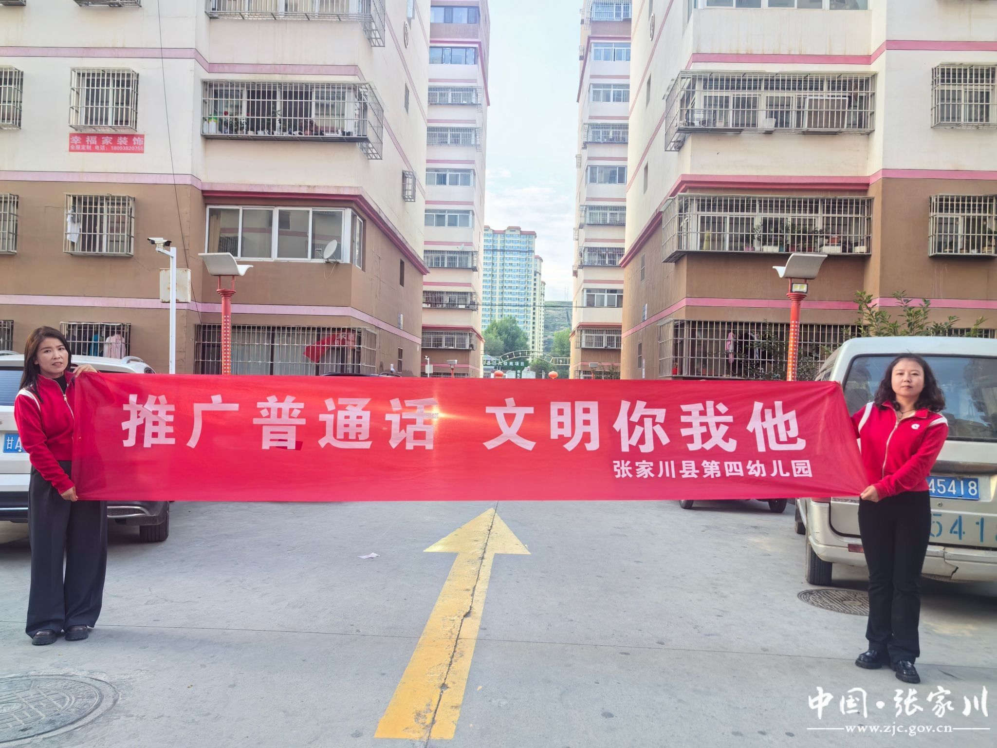 张家川县第四幼儿园教师走进和谐家园小区开展“小手拉大手、讲好普通话”活动,通过发放倡议书,引导家长和群众一起讲普通话,旨在提高大家的文明意识。
