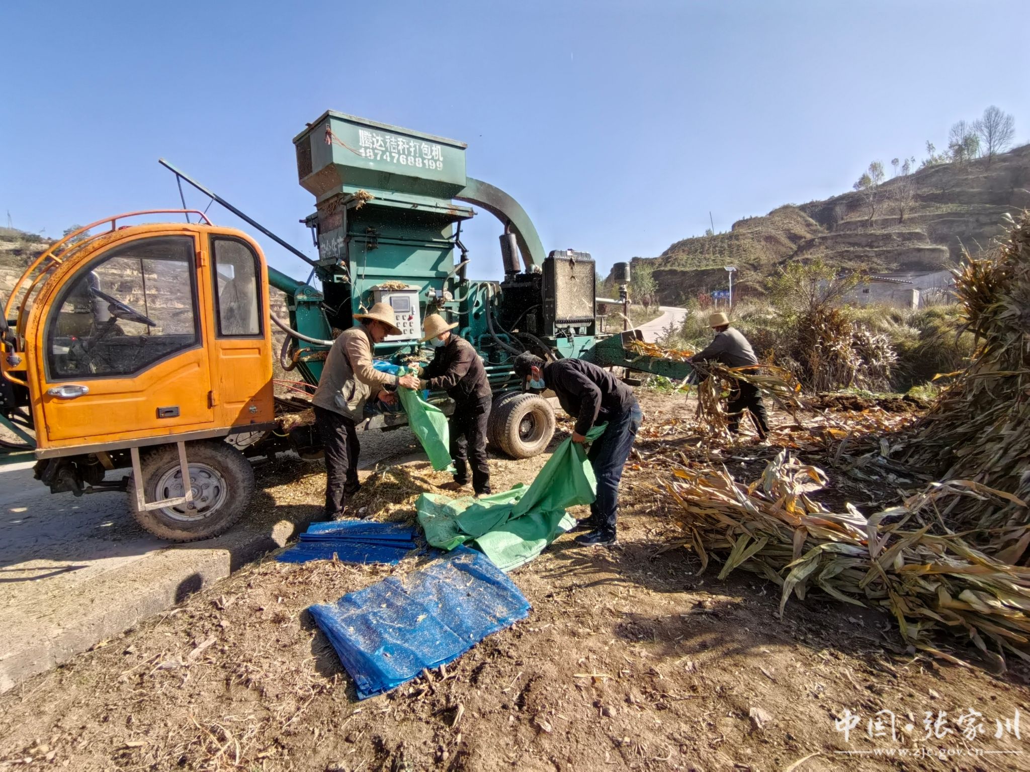 金秋时节,记者走进张家川县大阳镇黄贮秸秆现场,只见粉碎机嗡嗡作响,十多名农民忙碌不停,他们分工明确,干劲十足,现场一派热火朝天的忙碌景象。有的从地头的最远处将捆绑好的秸秆一捆一捆抱到粉碎机旁边,有的将玉米秸秆喂进粉碎机,整株秸秆伴随着轰鸣的机声瞬间变成碎屑,有的手拿蓝色和绿色的标准袋子在粉碎机的出草口等待“吐”出的黄贮饲料快活地“跳进”双层打包袋,然后迅速敏捷地将口袋一一捆扎,码放整齐。