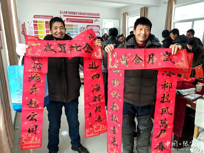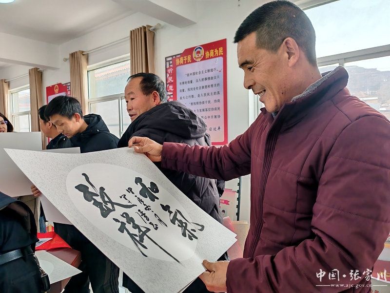 送春联现场,书画爱好者按照村民不同的需求,笔走龙蛇,一副副春联、一张张“福”字洋溢着对群众美好生活的祝福,吸引着一拨又一拨村民们。