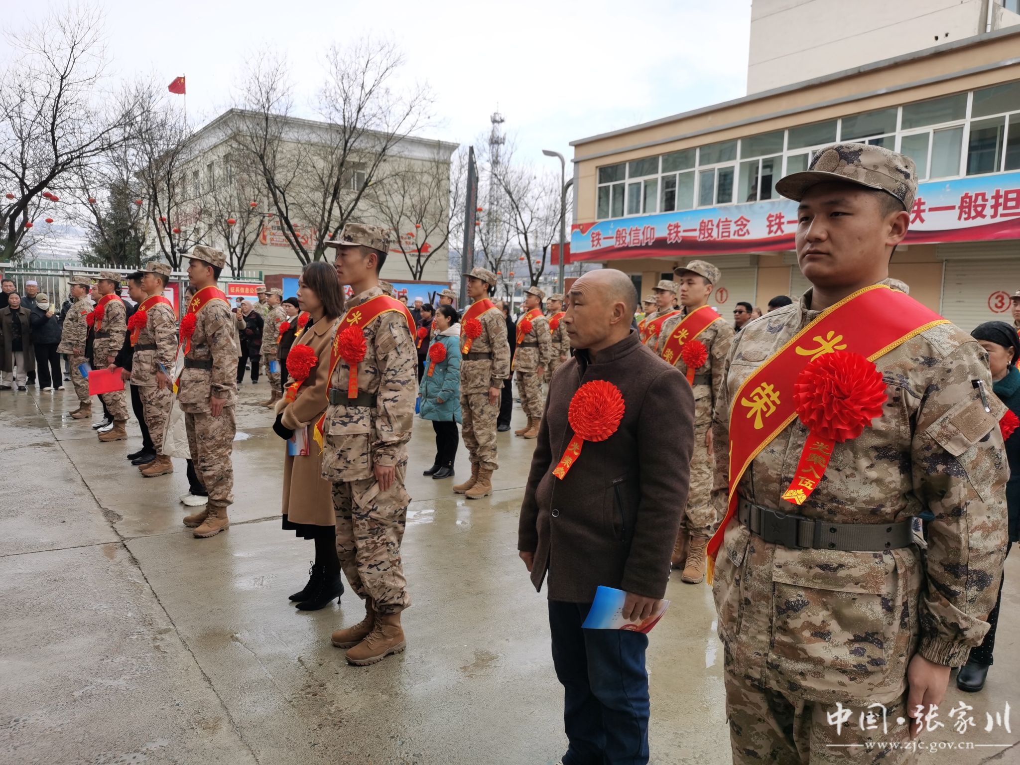 仪式现场,新兵们身着崭新的军装,身姿挺拔,胸前佩戴的大红花格外醒目,他们精神抖擞,眼神中透露出对军旅生活的期待和报效祖国的坚定决心。