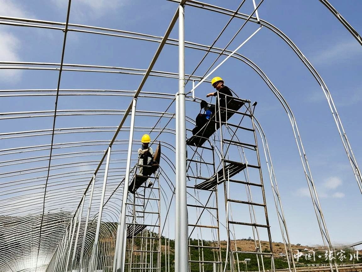 初夏时期,走进张家川县大阳镇大阳村,便能感受到一股蓬勃的发展气息,机器轰鸣,工人们正抢抓农时搭建蓝莓大棚。这片充满希望的土地上,工人们忙碌的身影与崭新的蓝莓棚相互映衬,构成了一幅生动的产业发展画卷。