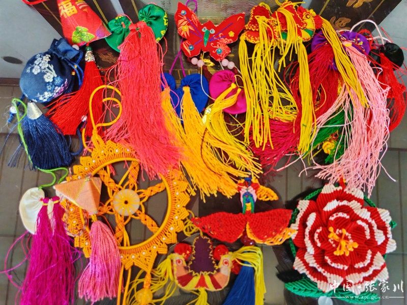 这会儿,付川村的李水萍家已经聚满了人。彩线在姐妹们手里上下翻飞,清亮的小曲声飘得老远:“秀一个荷包戴,绸缎裹着来,将五星的花线买呀嘛回来……”王会香是村里有名的“快嘴巧娘”,说话时总爱拍手笑,绣针在她指尖“嗒嗒”飞,比小曲的节奏还快。她说,那几个是她妈妈留给她的,这几个是她用粉色细线钩的荷花荷包,花瓣层层叠叠,里头塞满新割的艾草,还没绣完,就被人抢着预订:“给我留一个!这模样摆在店里,准能卖爆!”