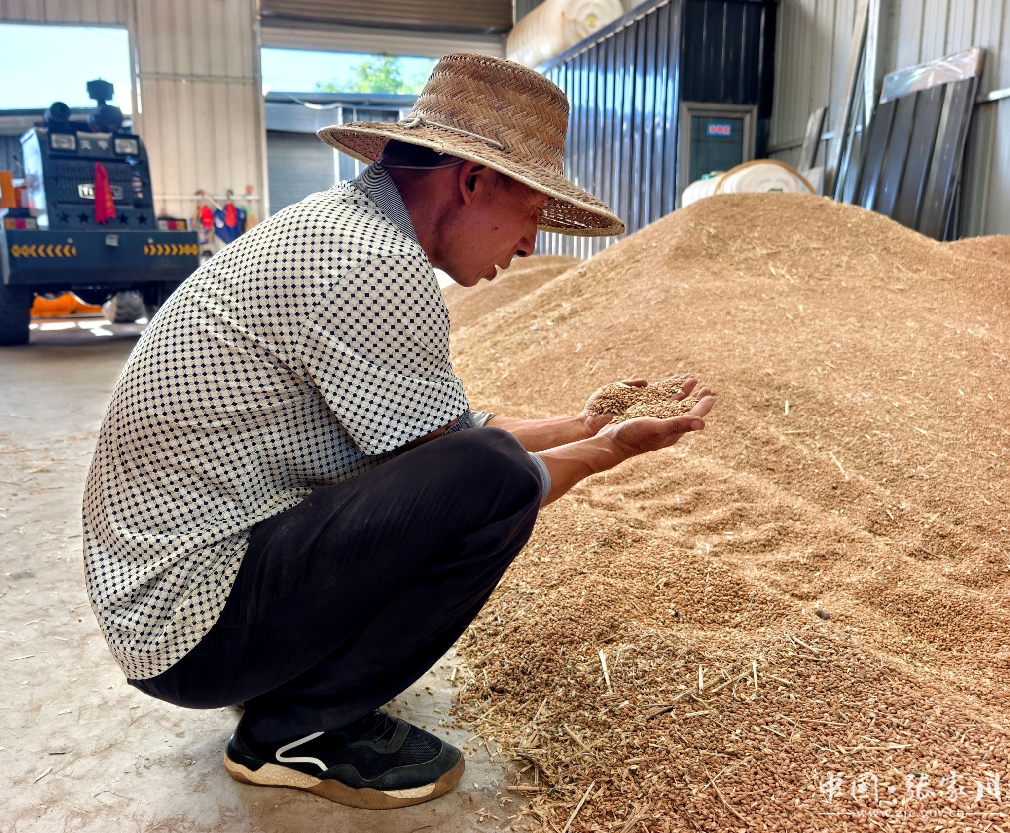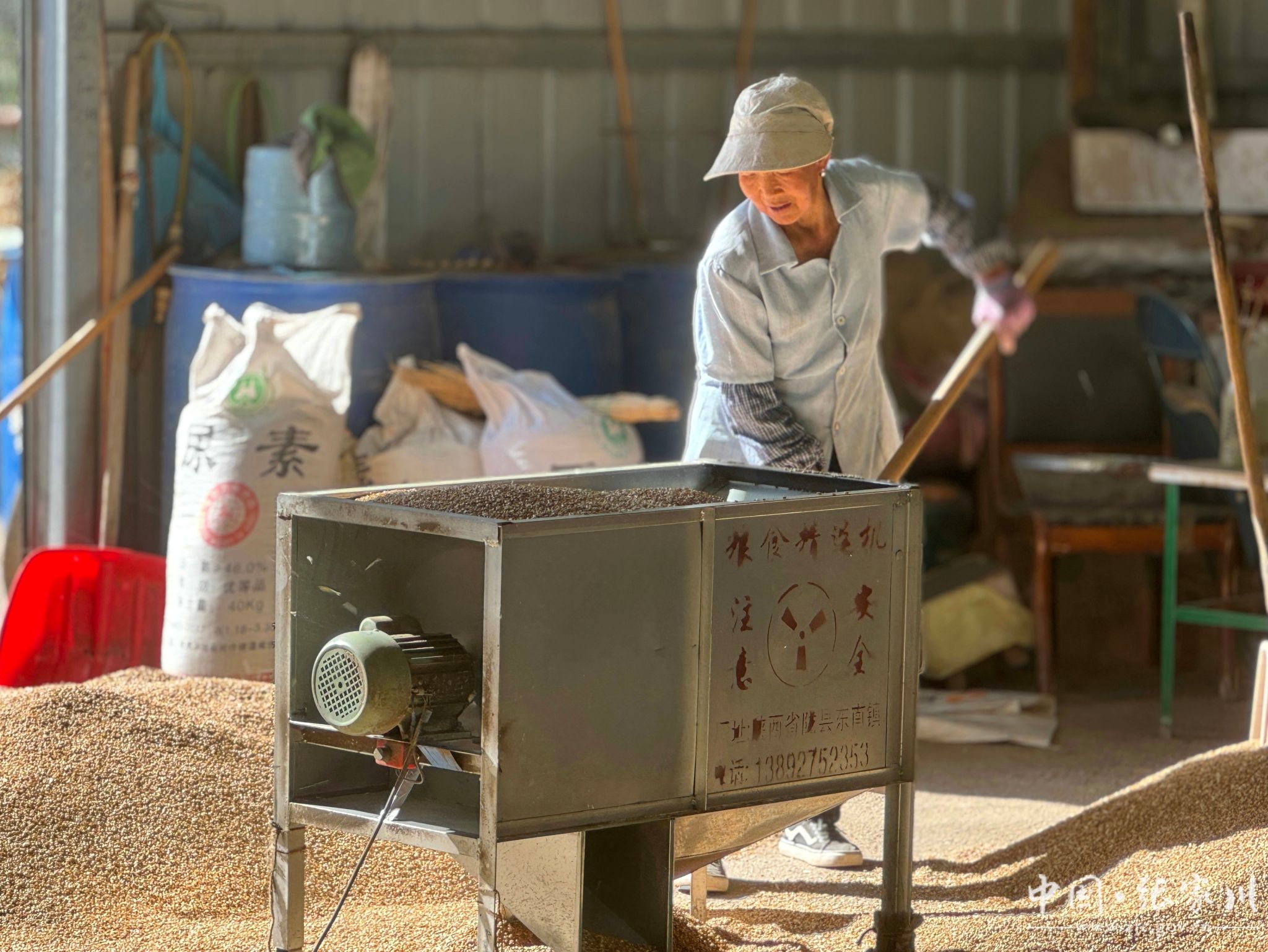 在合作社的晾晒棚里,工人们正忙着晾晒小麦良种。一粒粒小麦种经过粮食精选机的筛选、除杂后,饱满的麦粒铺展在场地中,在阳光下闪烁着金黄的光泽,工人们不时翻动着麦堆,确保每一粒种子都能充分接受阳光的晾晒,为后续的存储、出售、播种做好准备。