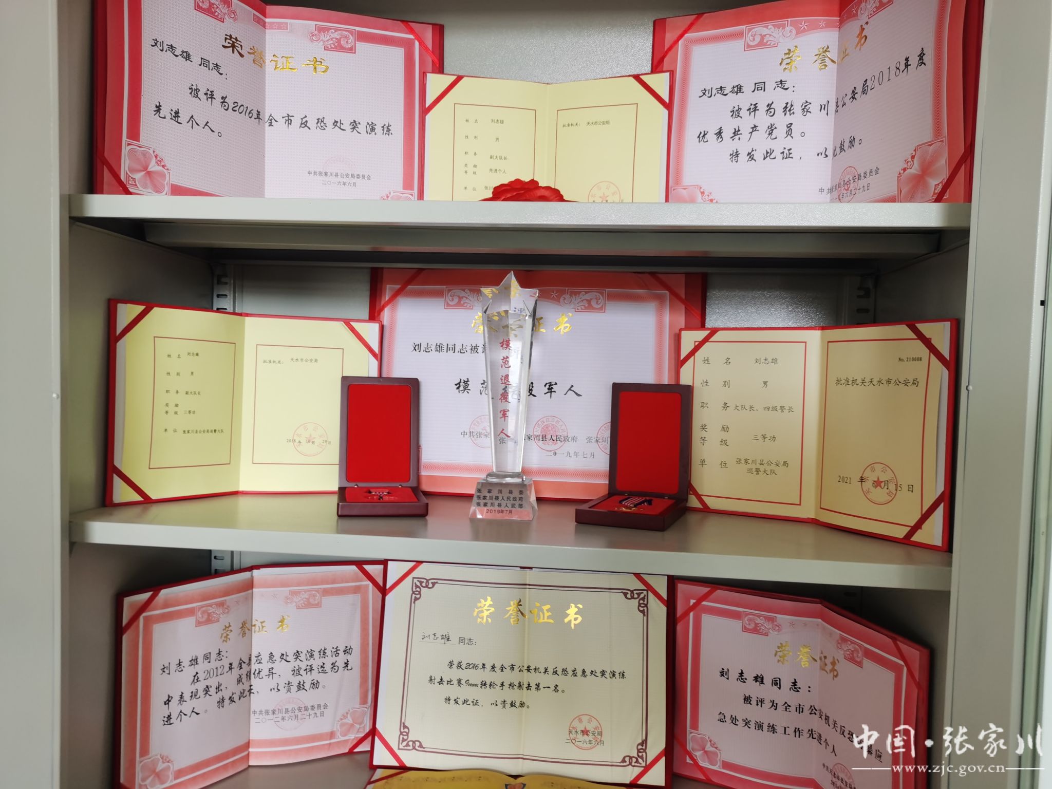 刘志雄,中共党员,2004年12月参军入伍,2009年12月退伍,2011年8月参加公安工作,现任张家川县公安局特巡警大队大队长,一级警司警衔。退伍后从警以来,先后被评为“全市公安机关先进个人”一次、“全县公安机关先进个人”三次,并荣获“优秀共产党员”、“全市公安机关个人三等功”一次、“全市公安机关手枪射击比赛第一名”等荣誉称号。