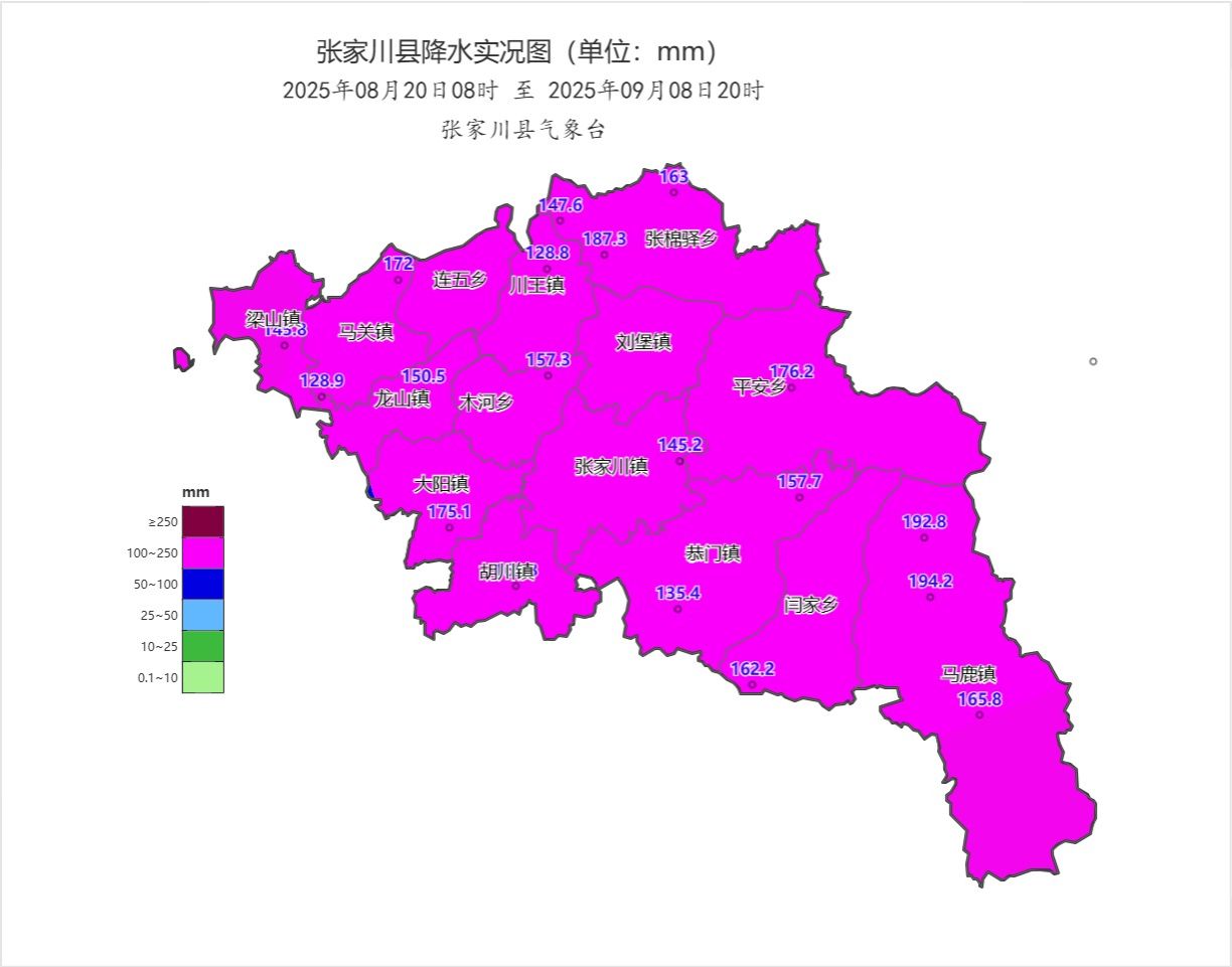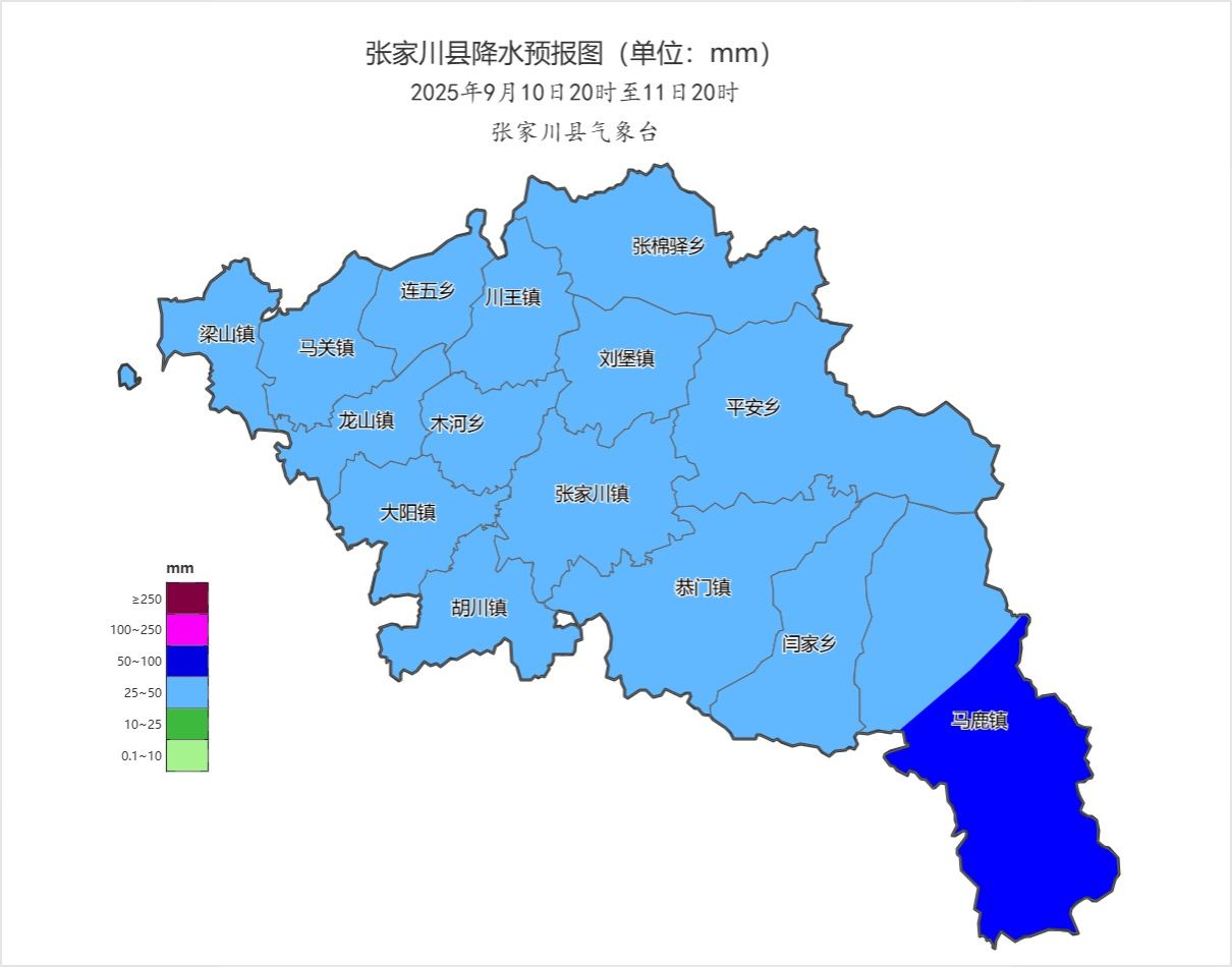预计9月10日夜间至11日白天,张家川县有一次明显降水天气,量级以大雨为主,东部乡镇有暴雨,过程最大累积雨量30~50毫米,东部个别乡镇最大可达50~70毫米。主要降水时段为9月11日05时~11日12时,期间伴有短时强降水,最大小时雨强20~40毫米。需注意防范降水叠加引发的地质灾害及局地强降水引发的山洪、城乡积涝等次生灾害。