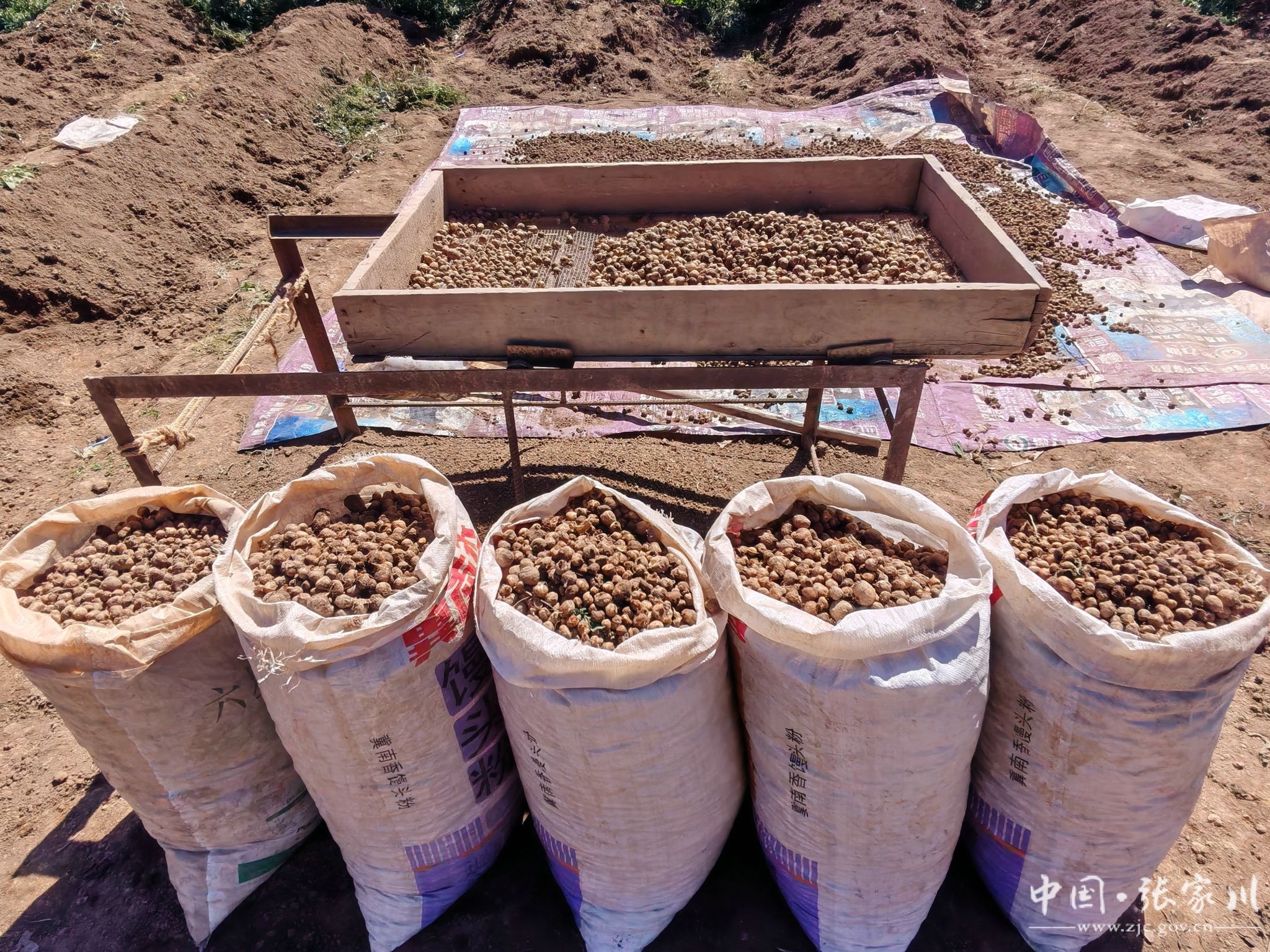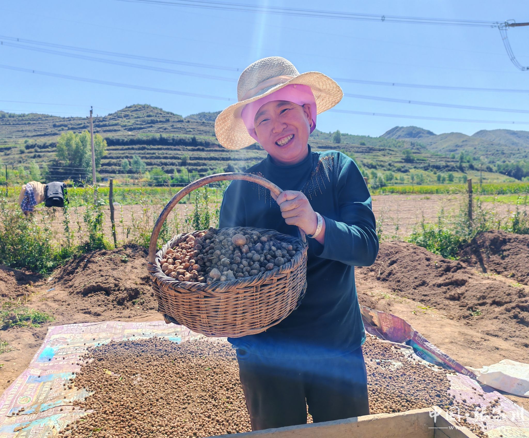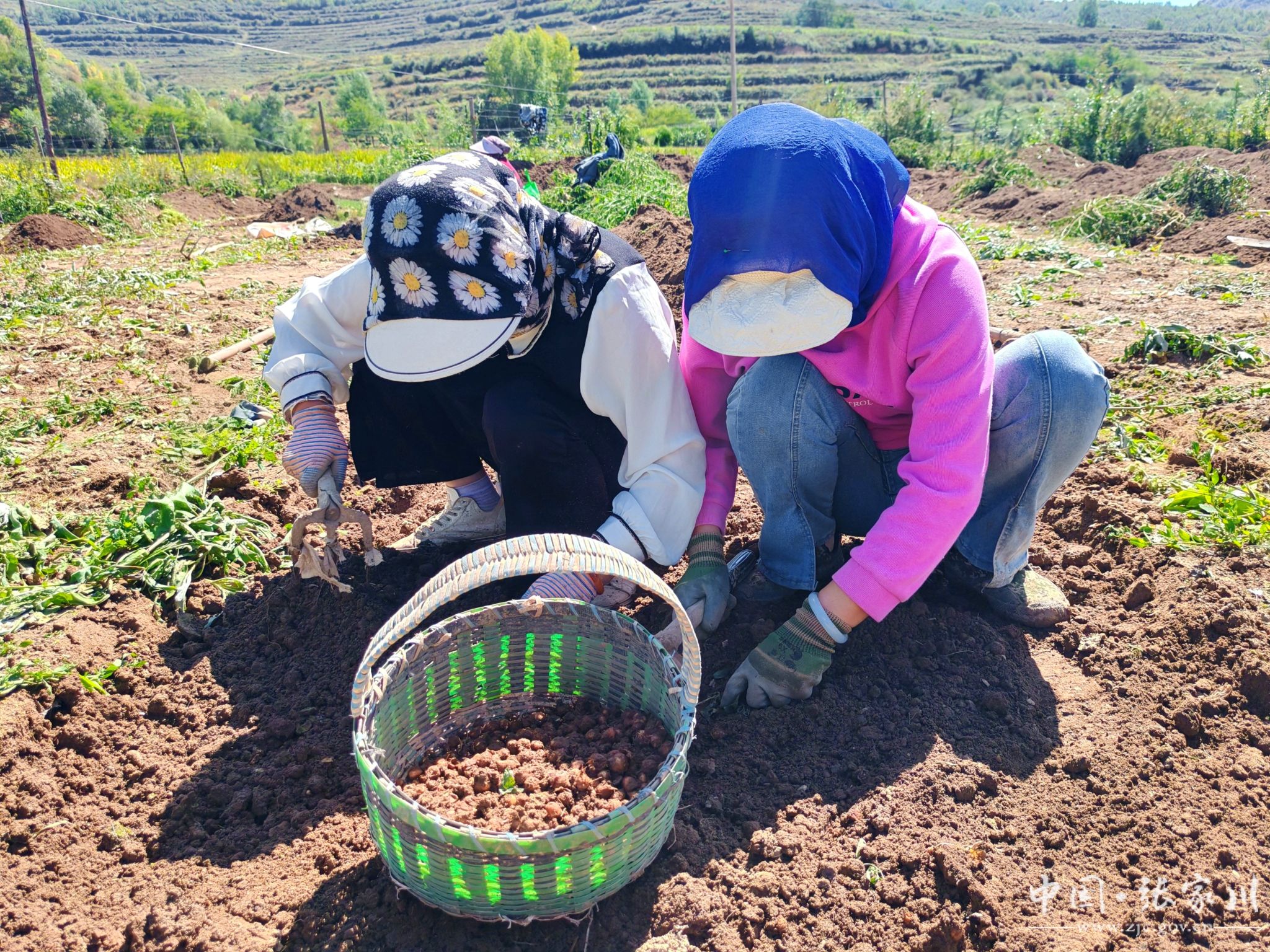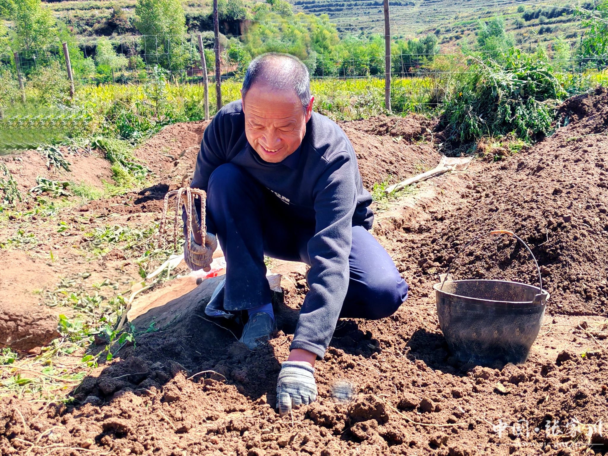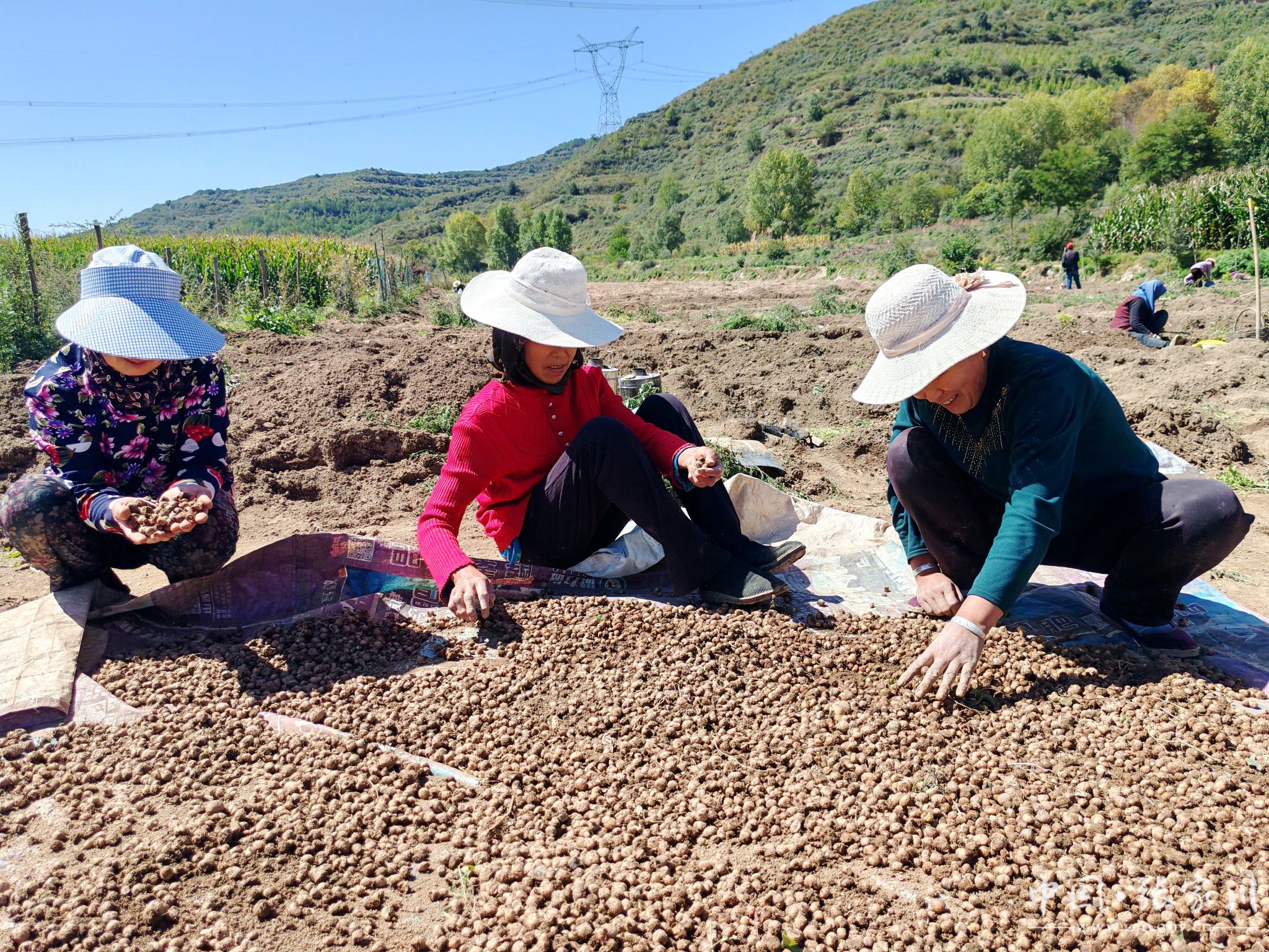 半夏是一味常用中药材,张家川县域内早有野生分布,人工种植则是近几年兴起的新产业。近日,记者走进闫家乡的田间地头,秋日暖阳下,半夏采收正呈现一派热火朝天的景象:村民们面前摆着竹篮,手握小锄头,弯腰耙土、拾捡半夏、装篮入袋,随后通过筛土、称重等工序,新鲜的半夏很快堆满田埂——这既是采收季每天的固定流程,也是工人们实打实的收入来源。