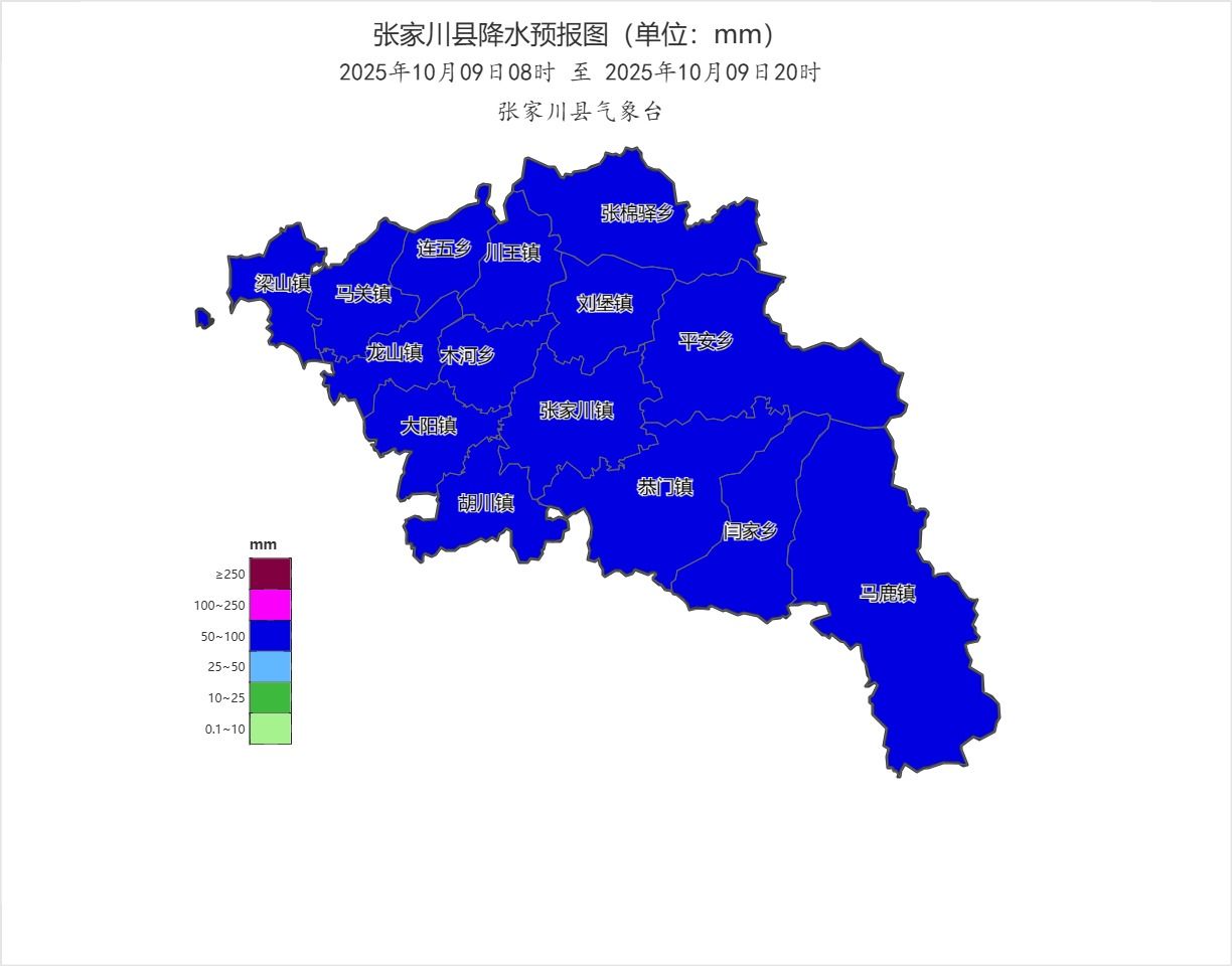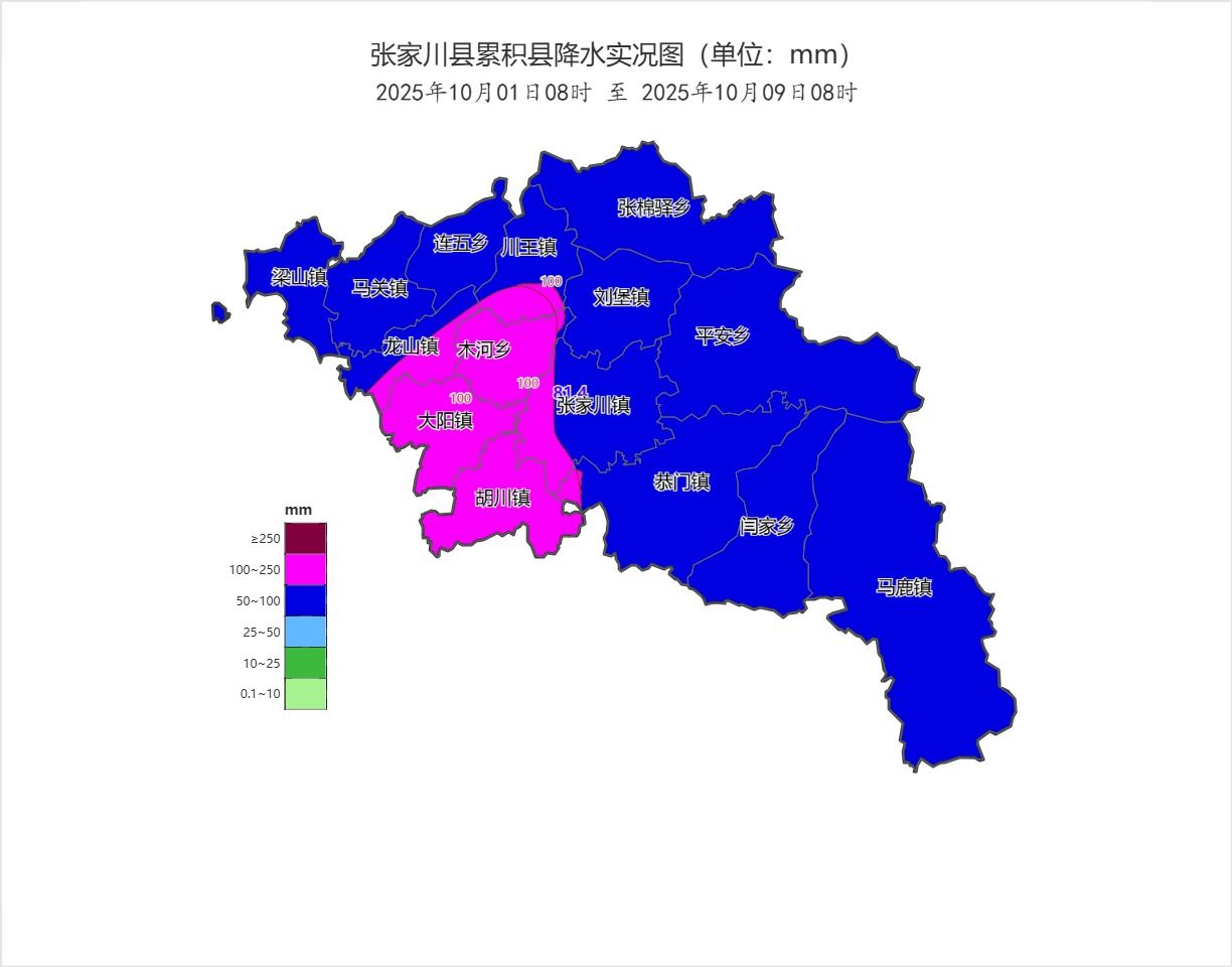 10月1日08时至9日08时,张家川县已出现多轮连续性降水天气,全县大部分乡镇累积雨量在50~100毫米之间,胡川、大阳、木河、大阳、张家川等乡镇累积雨量超过100毫米,其中,城区累积降雨量为81.4毫米,最大累积降雨量出现在胡川为115.5毫米。