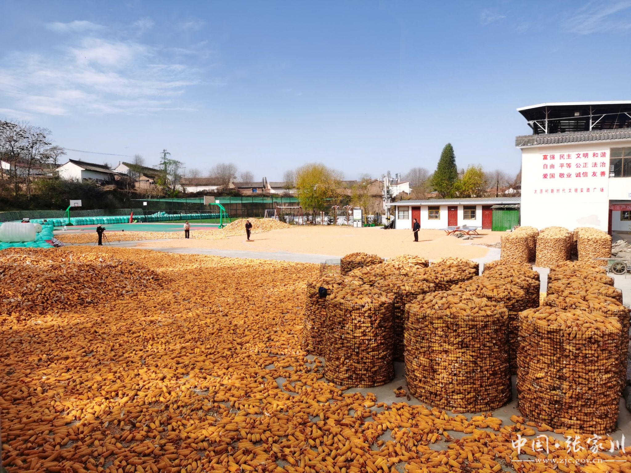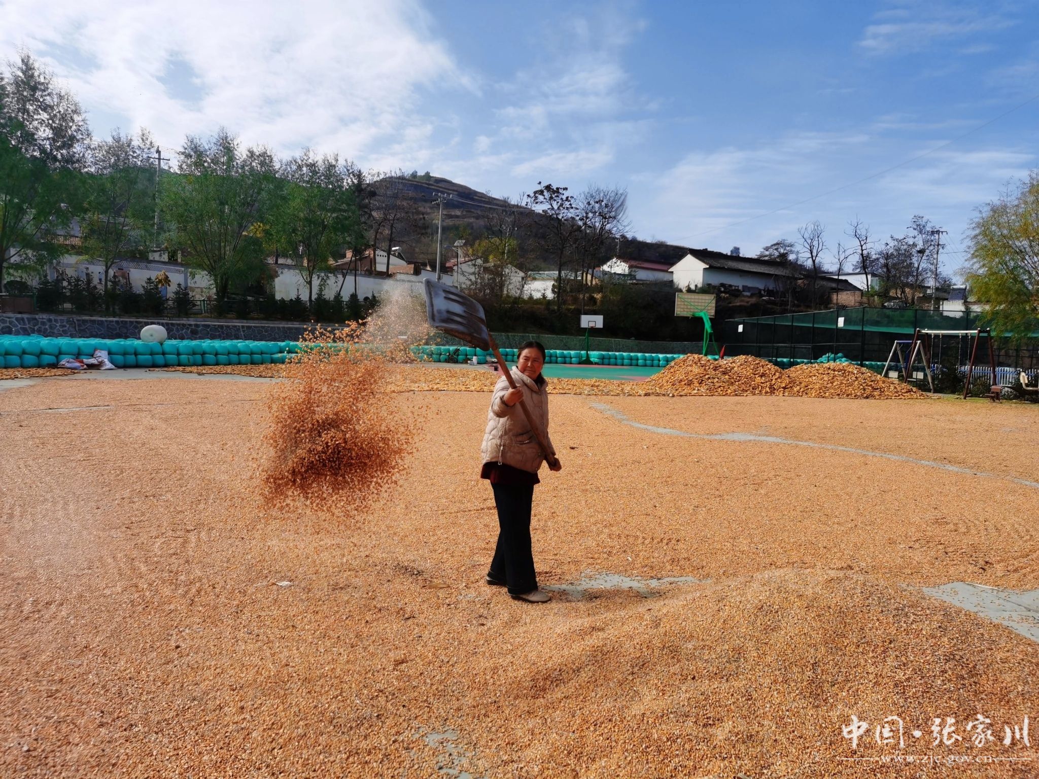 饭香还没散,晒场就热闹了起来。院外的公共晒场上,云台山合作社的玉米早已铺成了金黄的“地毯”——有的摊开晒成焦干颗粒,有的裹膜封成青贮垛,阳光洒在玉米粒上,闪着油亮的光泽。挥着木锨把玉米摊得匀匀的,吕许兵帮王奶奶把玉米推到向阳处,顺手拾捡着漏粒,挨墙码起的青贮垛,整整齐齐,开春喂牛正合适”。没人组织,可晒场里的活儿,总有人顺手接过来,你搭一把手,我帮一个忙,热乎劲儿比灶上的散饭还足。