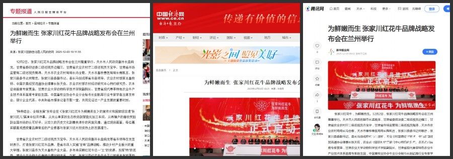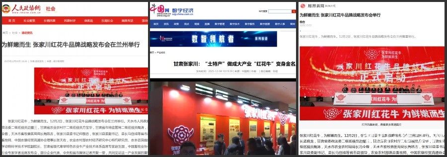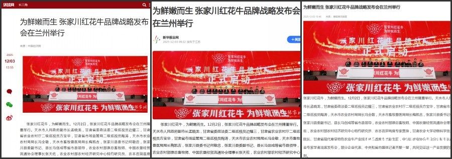 截至目前,新华社甘肃频道、人民政协网、人民日报社《经济周刊》、经济日报社《中国经济网》、央广网、央视频、凤凰网、腾讯新闻、网易新闻、环球网、搜狐新闻、新浪新闻客户端、中国网、凤凰新闻、和讯新闻、新华报业网、甘肃日报、甘肃电视台、甘肃农民报、甘肃经济日报、天水融媒、天水在线和张家川融媒等中央、省市县媒体已通过图文、视频等多种形式展开立体报道,相关话题持续引发社会关注。随着媒体传播的持续发酵,张家川红花牛正以更鲜明的品牌形象、更优质的产品口碑,走出甘肃、走向全国,让更多人领略“陇上名牛”的独特魅力。