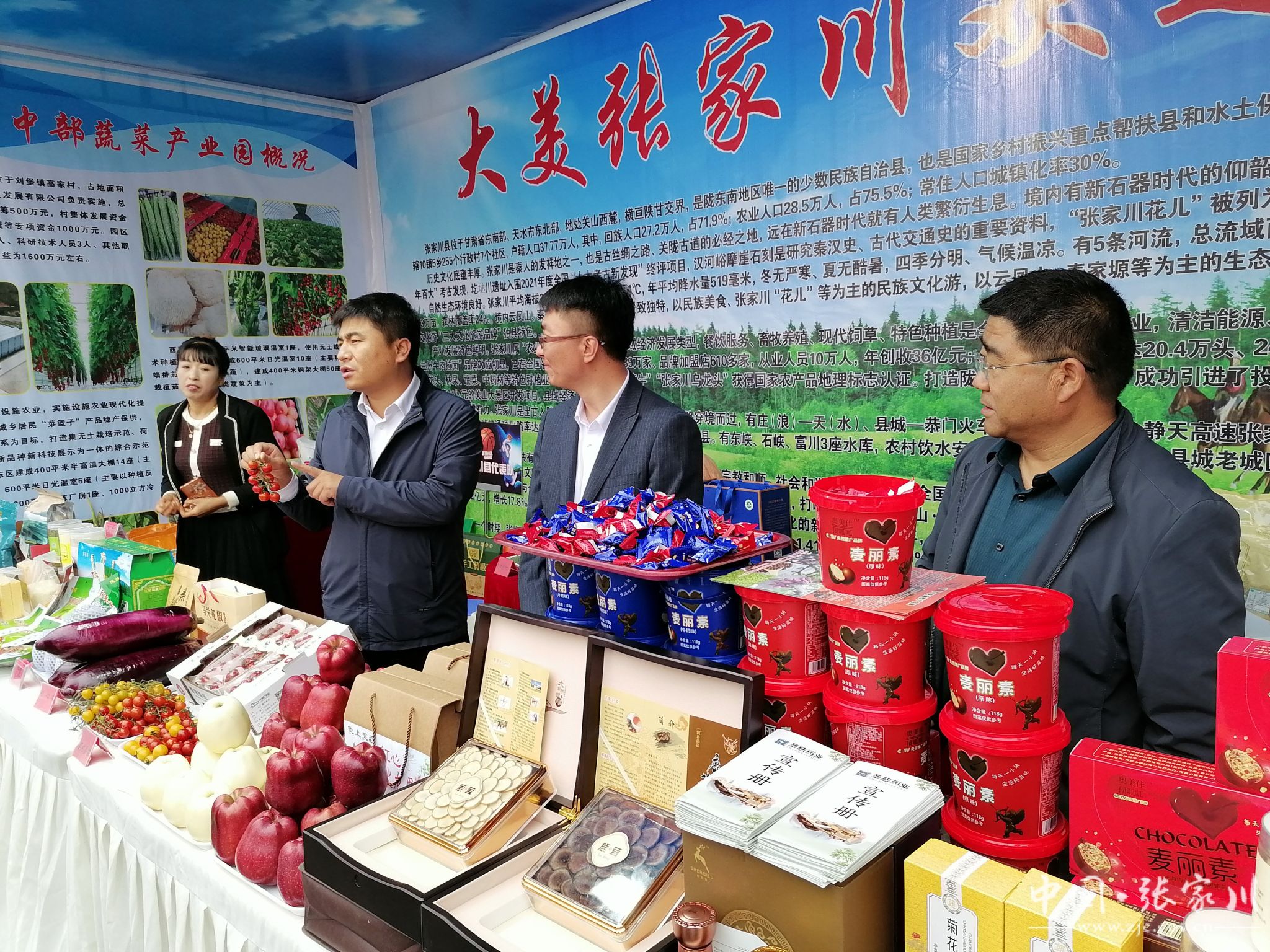 本届大会共有来自全市7个县区及果品企业参加布展。张家川县农业农村局精心选送荣达花牛苹果、富红玉露香梨、马关阿阳红花椒、陇上丹凤大樱桃、薄壳核桃、樱桃西红柿亮丽登场,五谷杂粮、清香牛肉、万福香醋、圣慈中药材饮片、鹿酒系列等特色农产品集中亮相,受到巡展的市县领导、采购商及社会各界高度关注和好评。张家川县奥美佳食品科技有限公司推出的新品“麦丽素”巧克力豆销售热度一路高涨,成为张家川县农特产品展现市场竞争力的缩影。