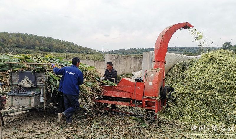 在马建荣的大厂养殖场,记者看到,工人们正在青贮玉米饲料,一根根翠绿的玉米杆在粉碎机的大口中,变成了玉米丝,机器飞速的转动,工人们干劲十足,似乎在和机器比速度。
