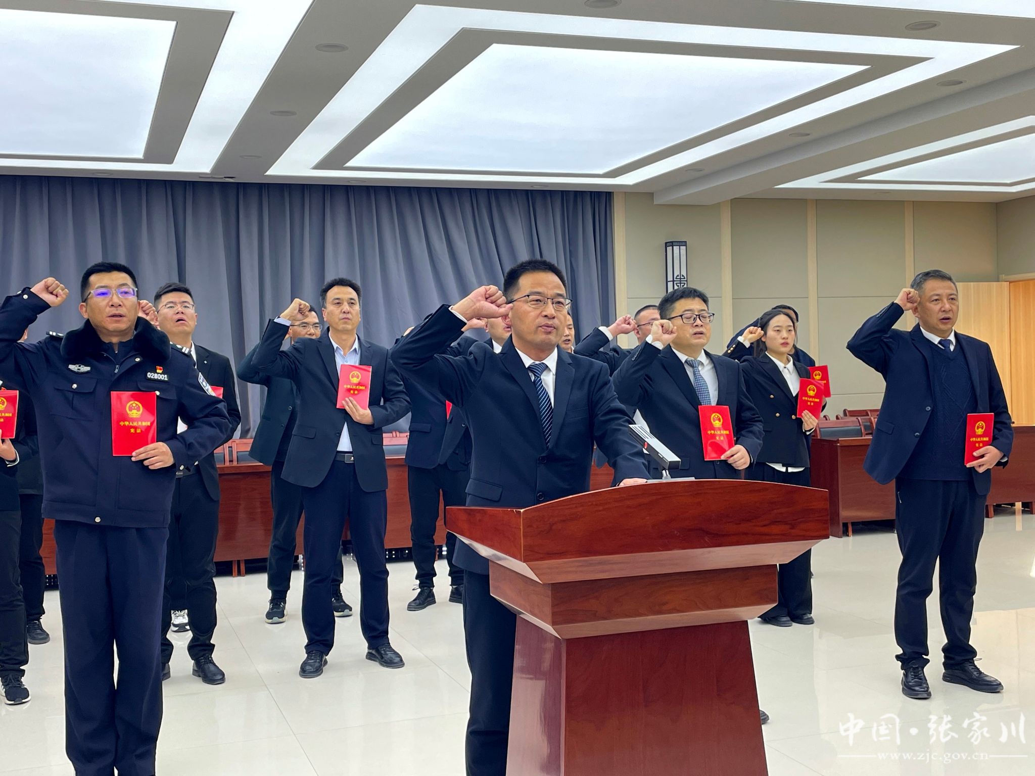 会议室内国徽高悬,国旗庄严,宣誓台上摆放着《中华人民共和国宪法》。下午3时整,宣誓仪式开始,全体人员肃立,现场奏唱中华人民共和国国歌。领誓人刘润斌左手按着《中华人民共和国宪法》,右手举拳,宣读誓言,其他宣誓人在后方列队站立,右手举拳,跟诵誓词,作出了忠于宪法、忠于祖国、忠于人民的庄严承诺,表达了恪尽职守、廉洁奉公的坚定决心。