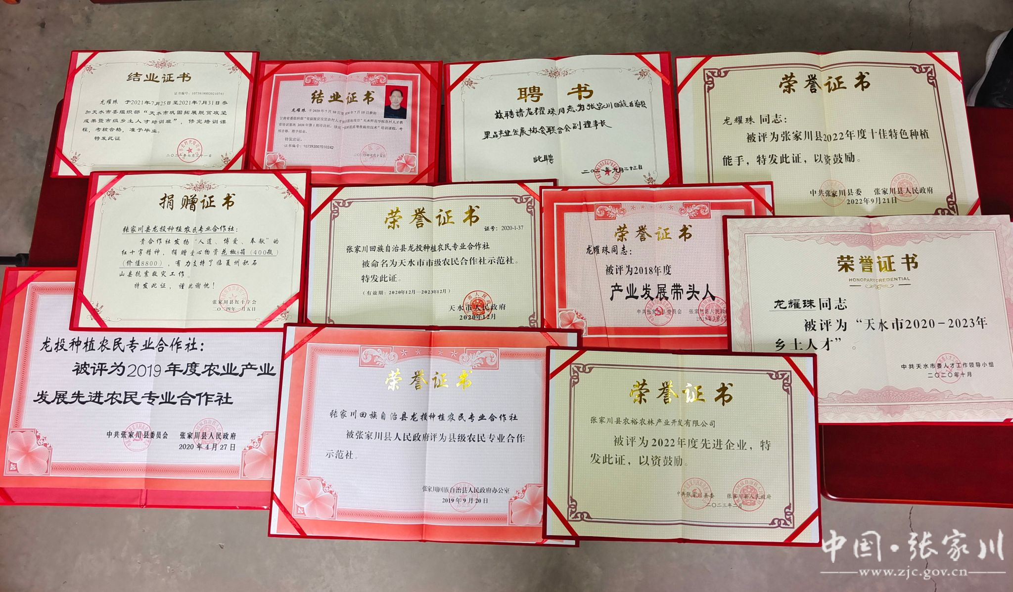 一份份付出,赢得了一份份荣誉。龙耀珠2019年3月被中共张家川县委、县政府评为“2018年度产业发展带头人”;2020年10月被中共天水市委人才工作领导小组办公室授予“乡土人才”荣誉称号。龙投合作社2020年12月被天水市政府命名为“市级农民合作社示范社”; 2020年4月被中共张家川县委、县政府评为2019年度农业产业发展“先进农民专业合作社”;2019年被县政府命名为“县级农民专业合作示范社”;2017年-2019年连续三年被马关镇评为“先进农民专业合作社”。