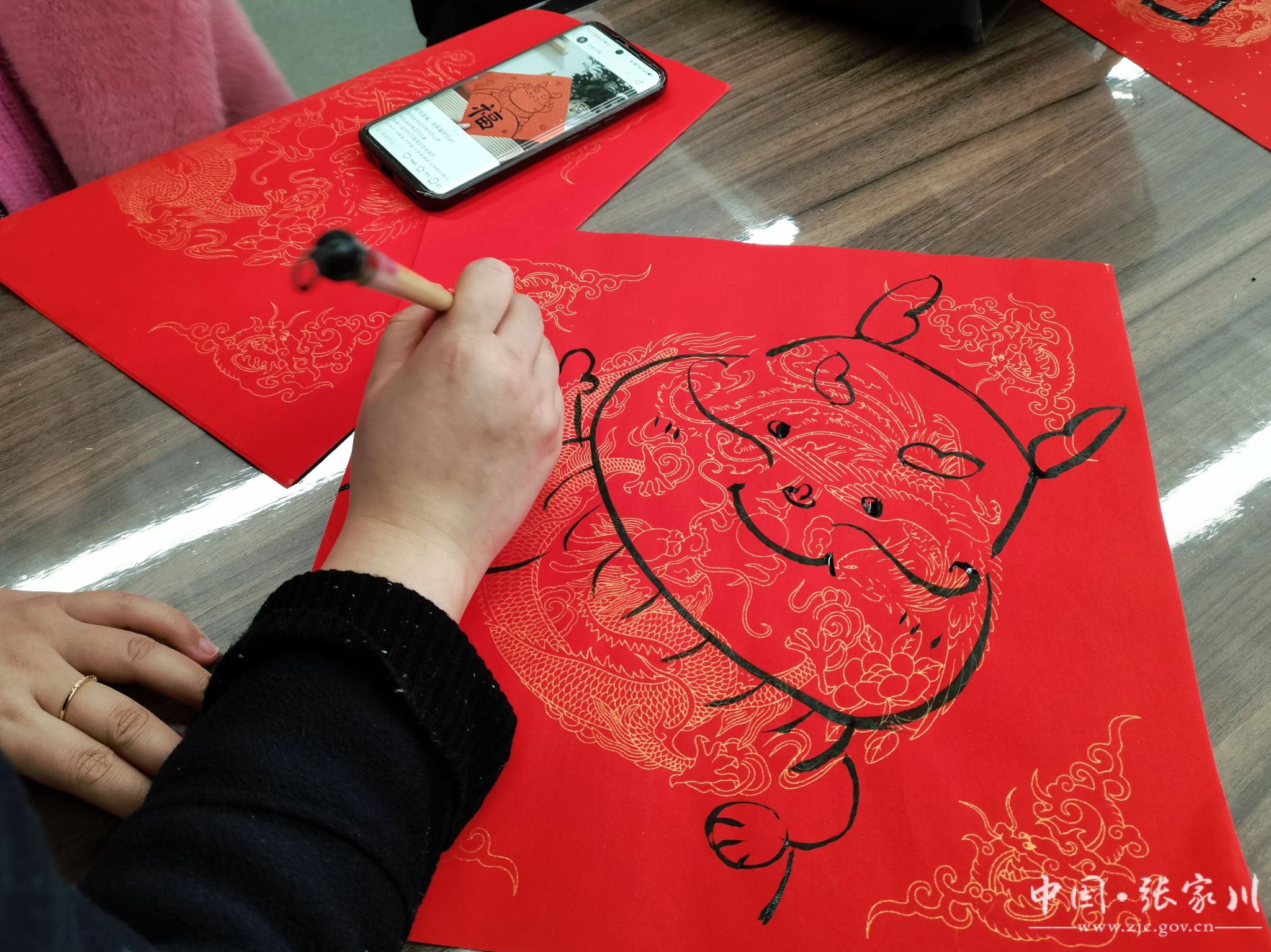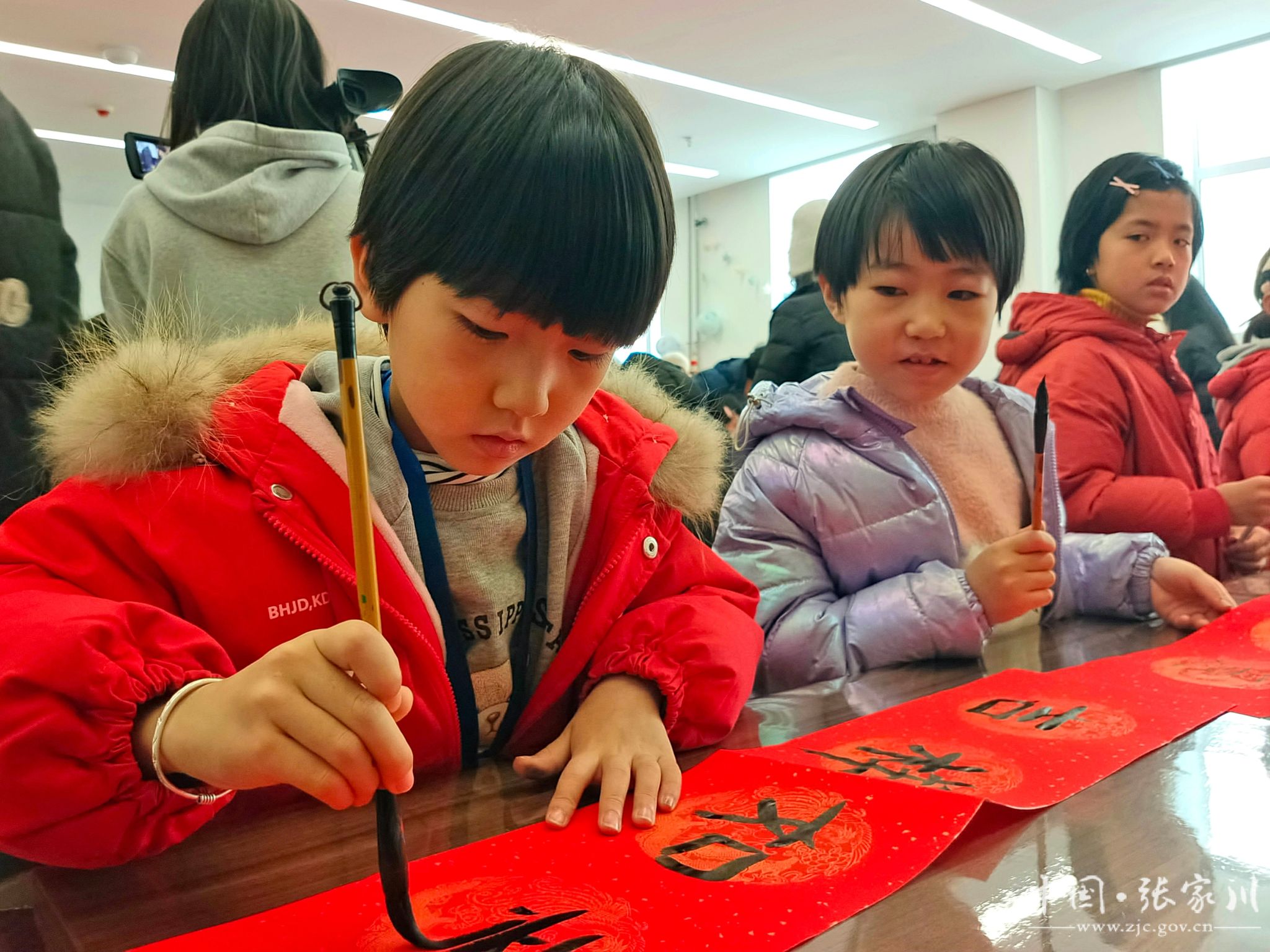 活动现场暖意浓浓,一张张充满新春气息的大红春联铺满桌面,好多孩子是第一次写春联,兴趣盎然,大胆动笔,隶书、楷书、行书的对联和福字呈现眼前,虽然稚拙,但各有特色,字里行间流露着对传统文化的热爱和向往,满载着孩子们新年愿景和龙年的祝福。
