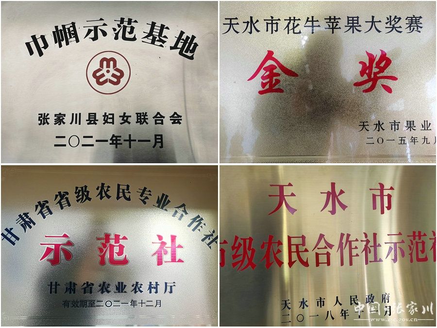 合作社通过不断的努力,2015年被评为县级示范社,在2016年全市花牛苹果评比大奖赛中获得金奖,2017年合作社果品基地被评为“天水市十大标准化示范基地”,2018年被评为市级农民合作社示范社。基地先后被天水市供销联社指定为技术生产示范基地,甘肃省大樱桃工程技术中心新品种试验示范基地,天水市师范教学实训基地,天水市果业协会培训示范基地,省林业局评为省级标准化示范基地。