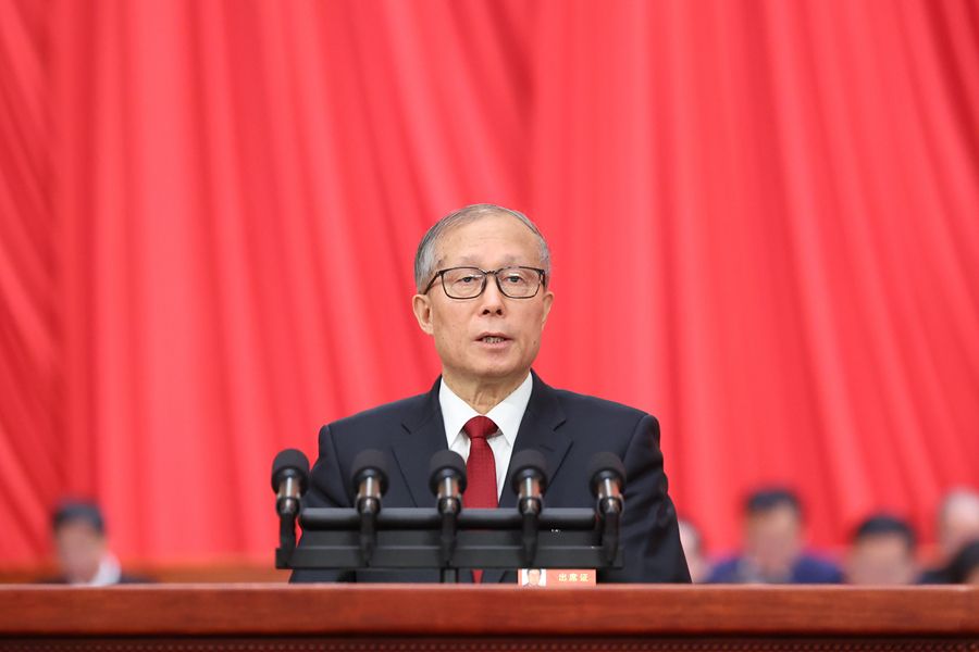 3月5日,第十四届全国人民代表大会第二次会议在北京人民大会堂开幕。受全国人大常委会委托,全国人大常委会副委员长李鸿忠作关于国务院组织法修订草案的说明。新华社记者 刘卫兵 摄
