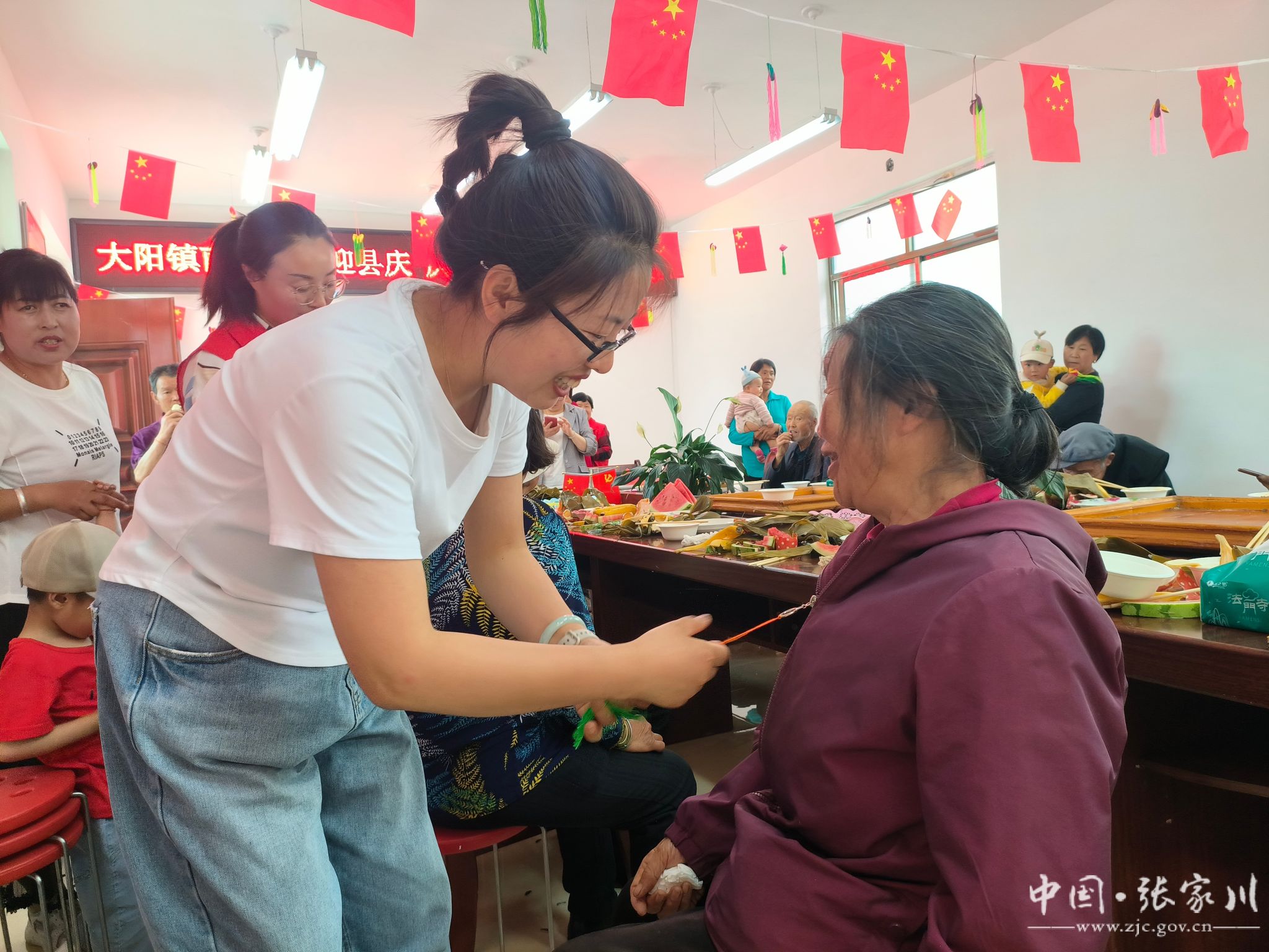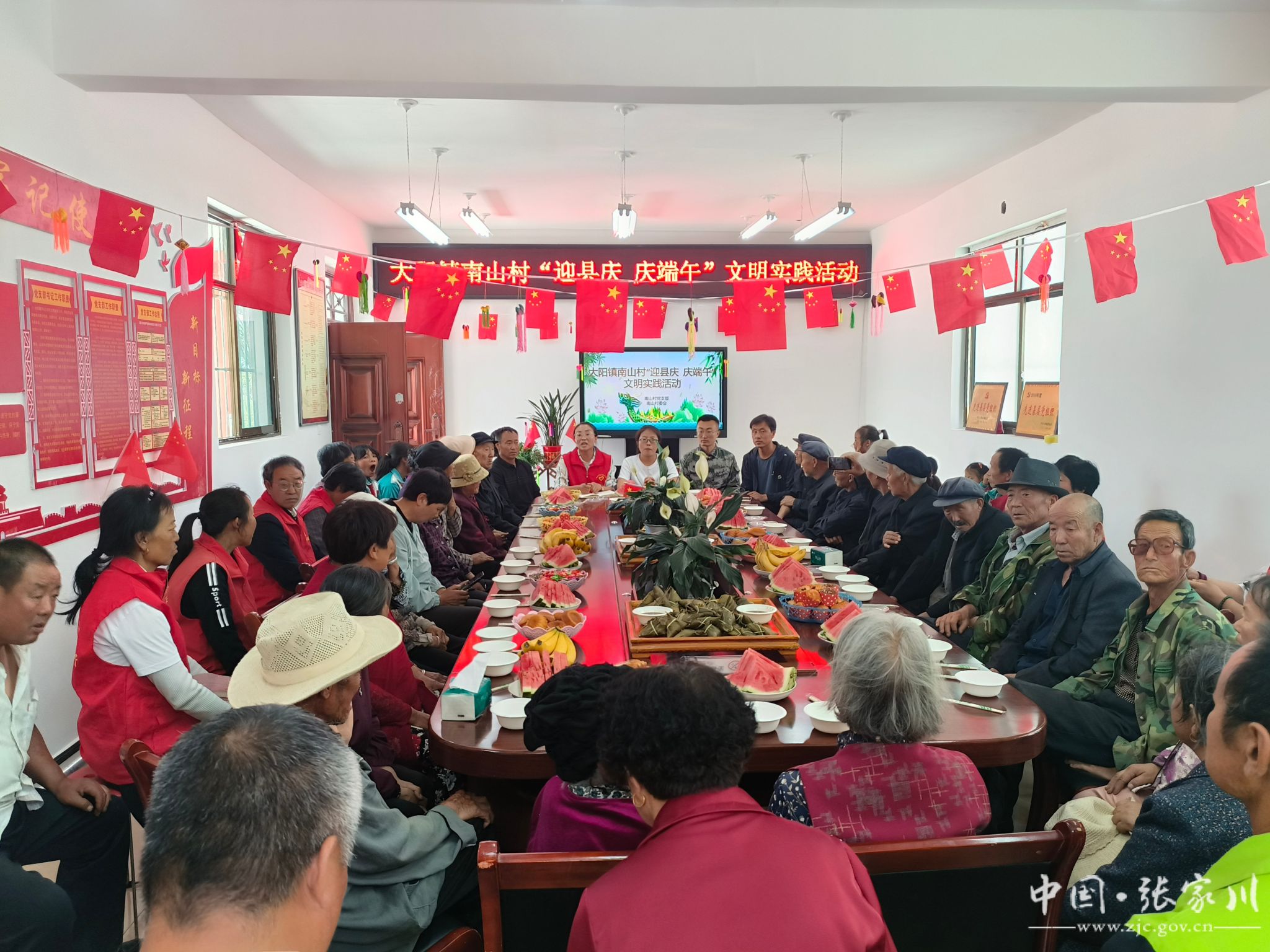 一场端午茶话会活动。南山村准备了粽子、水果、饮料、荷包等慰问礼品召开端午茶话会,为留守人员、孤寡老人等送去节日的祝福和亲切的慰问。