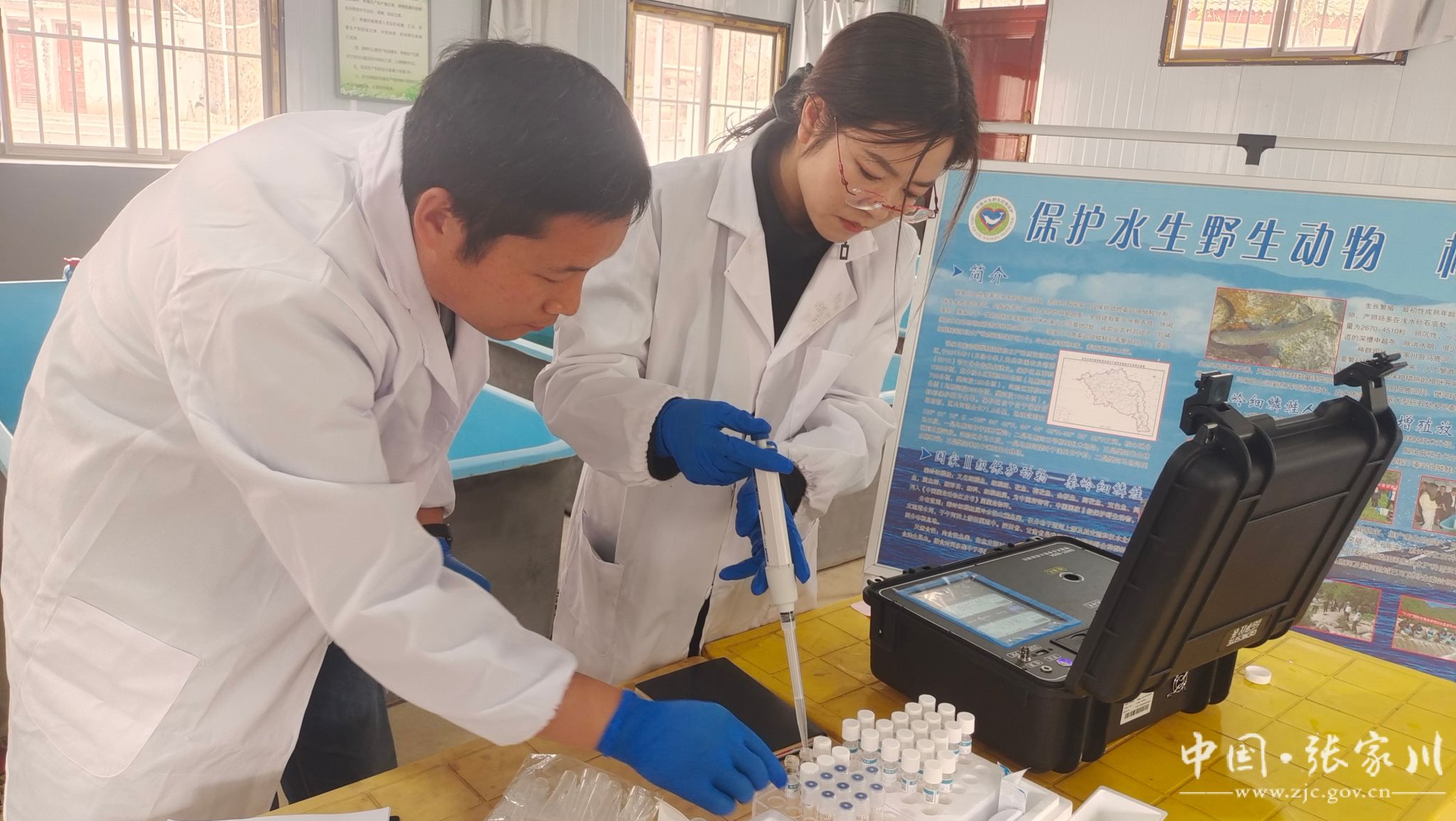 为推进水产养殖污染防治及养殖尾水达标排放,近日,张家川县畜牧中心组织技术人员深入马鹿镇花园村秦岭细鳞鲑驯养繁殖场,开展池塘尾水现场采样及水质指标检测工作。