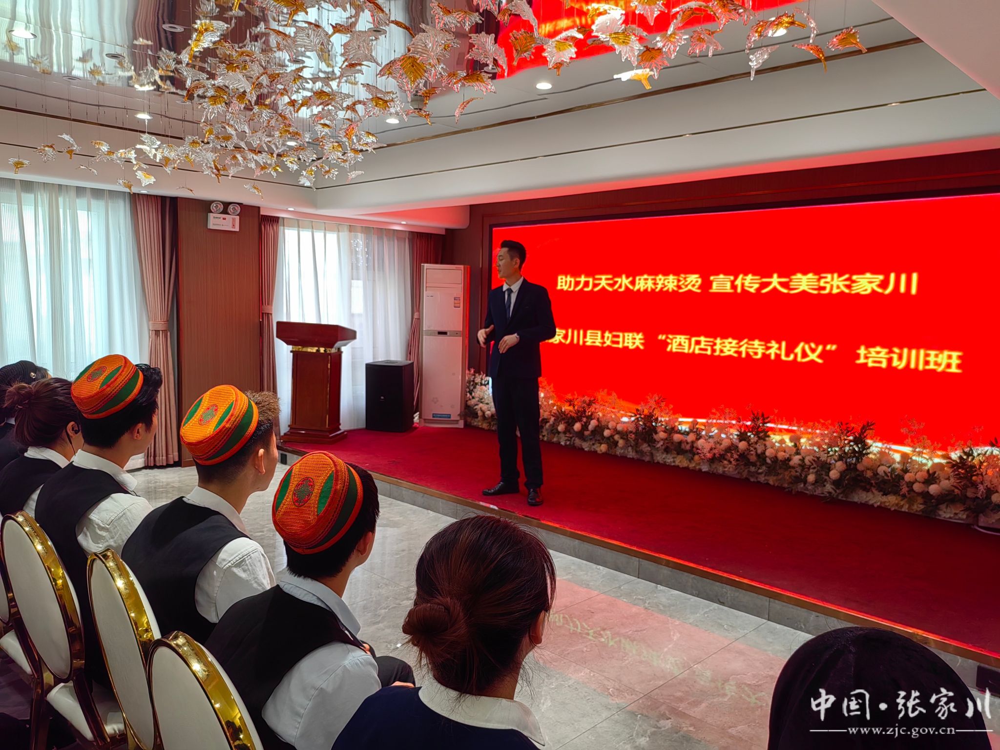 随着天水麻辣烫的持续火爆,张家川县迎来了旅游热潮。人无礼不生,事无礼不成。为了更好地迎接八方来客,宣传大美张家川的美食美景、文化历史和风土人情。近日,县妇联在几个规模较大的宾馆、饭店举办“接待礼仪”培训班,相关从业人员参加培训。