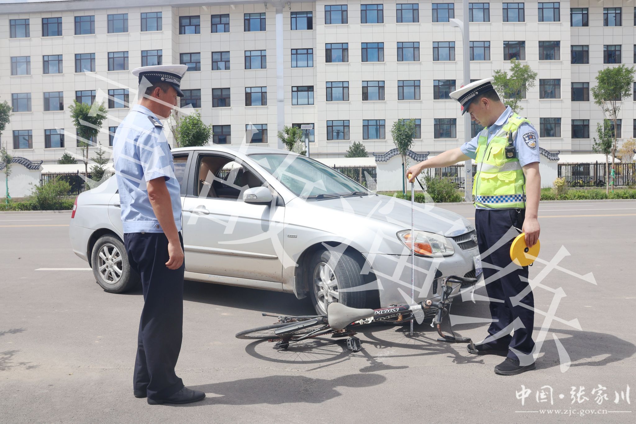 情景模拟:上午9时30分整,演练正式开始,值班民警接110指挥中心称:城区学府路一辆小轿车与一辆自行车相撞,造成两车受损、人员受伤的道路交通事故。接到报警后,事故处理民警迅速赶赴现场,兵分三路开展应急处置。第一路民警携带防闯入预警系统、反光锥筒、警戒带等装备负责现场外围交通疏导,分流事故现场车辆;第二路民警配合医护人员对伤员进行转移救治;第三路民警携带勘查器材进行模拟现场勘查。整个演练过程中现场处理紧张有序,分工明确,反映快速。此次演练活动依次完成对整个模拟事故现场的安全防护、现场警戒、现场调查取证、现场疏导交通和现场撤离等程序。