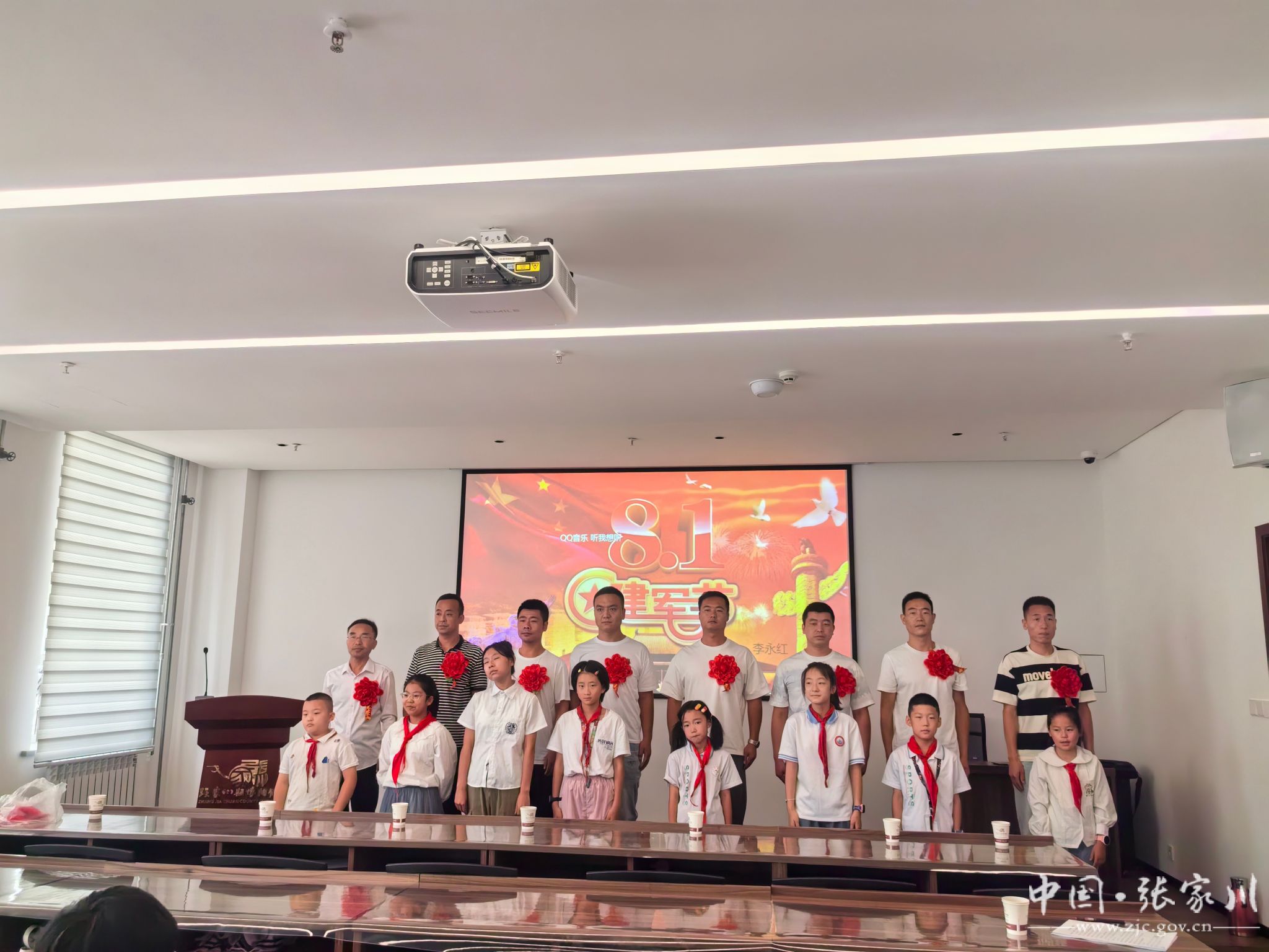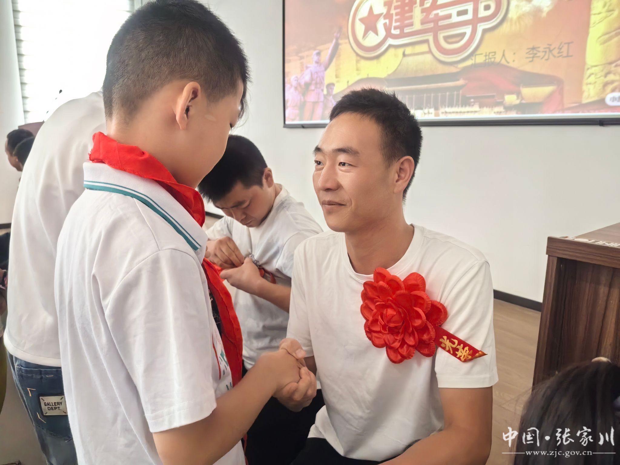 同时,邀请7名退役军人带领孩子们共同演唱中国人民解放军军歌,感悟革命历史发展足迹。少先队员向退役军人献上了大红花,退役军人为少先队员佩戴了红领巾,一朵朵大红花代表着青少年对革命精神的延续与传承,一条条红领巾代表着退役军人对祖国下一代的关怀与期盼。