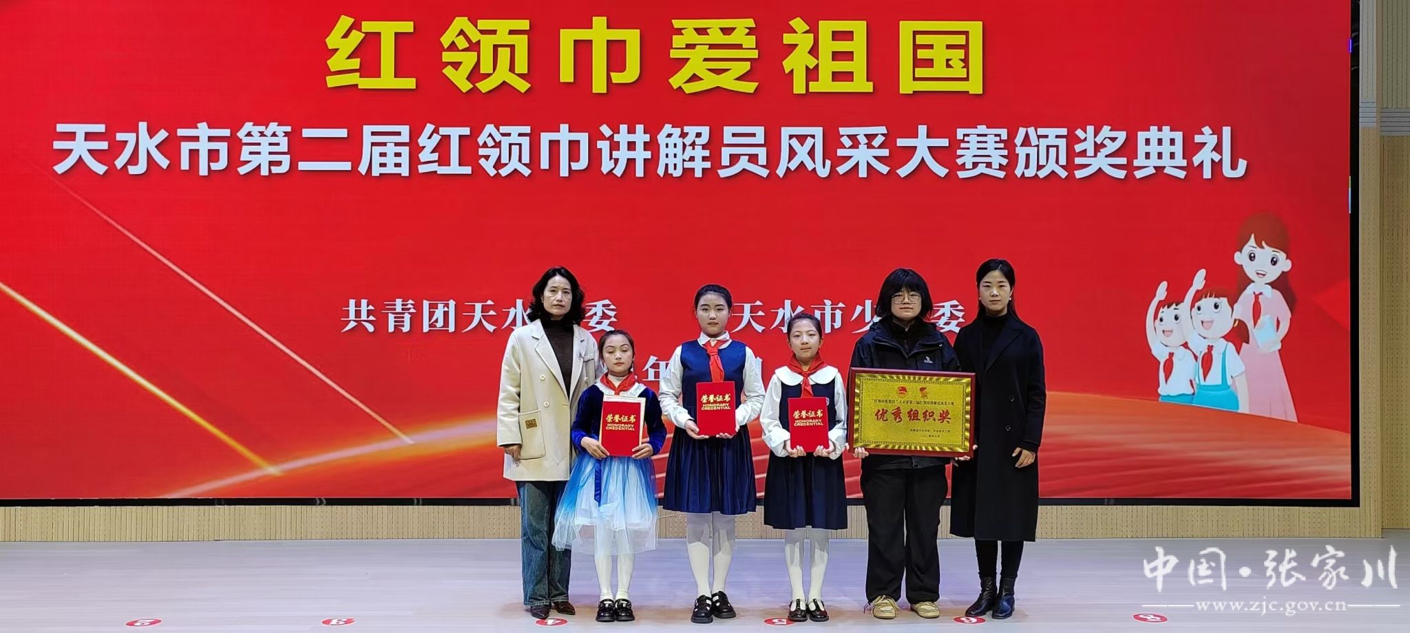近日 ,在“红领巾爱祖国”天水市第二届红领巾讲解员风采大赛总决赛中,张家川县2名少先队员获得三等奖,1名少先队员获得优秀奖,共青团张家川县委被授予优秀组织奖,2名少先队员被聘请为天水市红领巾讲解员。