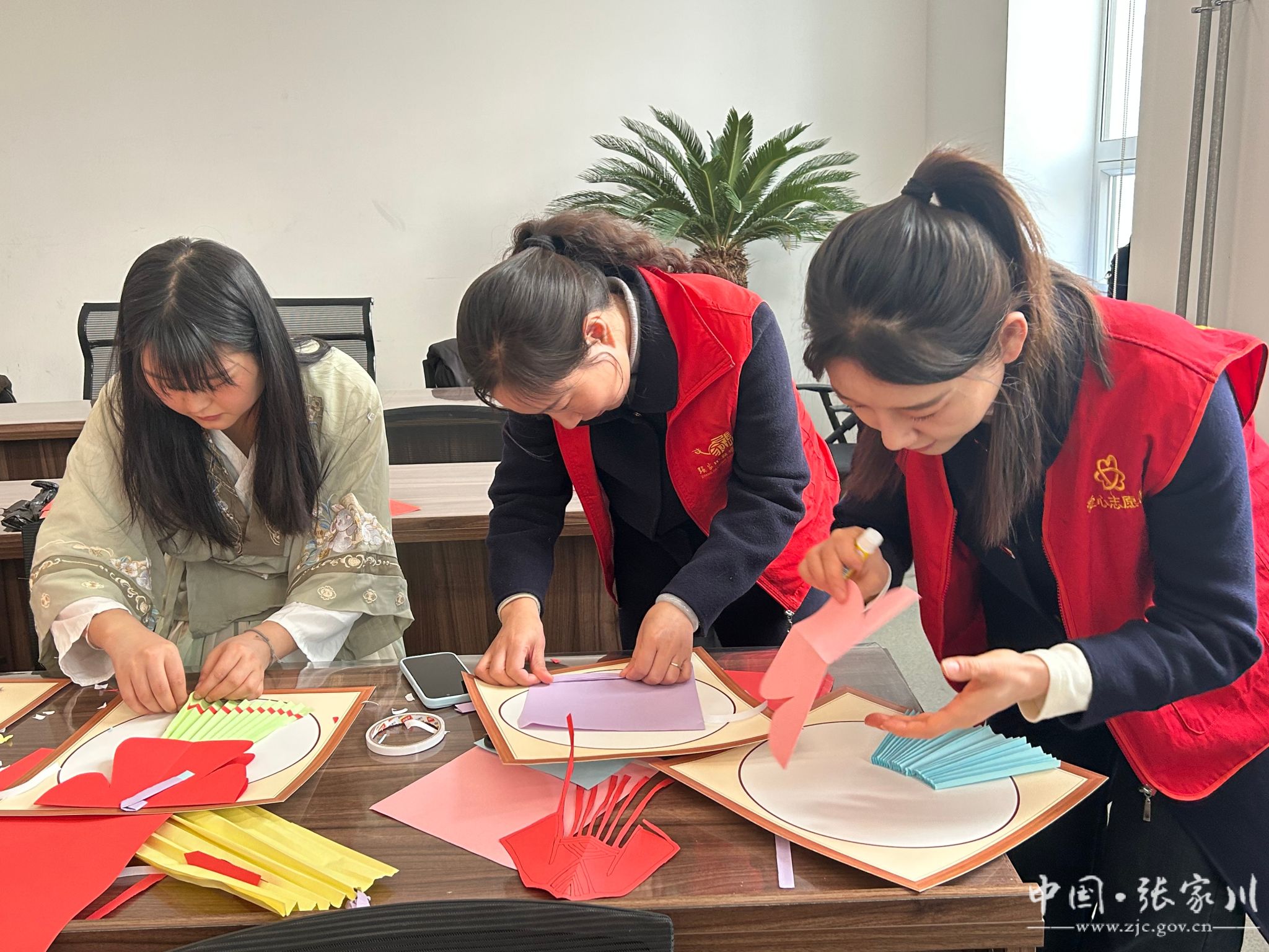 “汉服华韵 纸艺风华”剪纸手工体验。志愿者讲解剪纸起源、发展和基本技巧,现场演示折叠、绘图和裁剪过程,参与者尝试汉服简单图案的剪纸,将完成的剪纸作品粘贴展示,分享创作思路,现场气氛热烈。