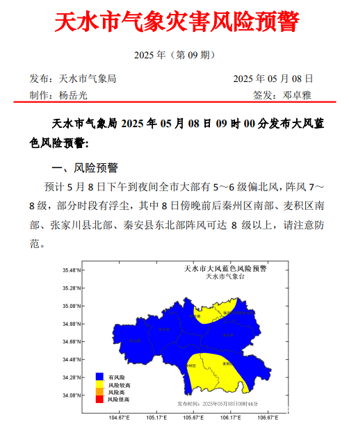 预计5月8日下午到夜间全市大部有5~6级偏北风,阵风7~8级,部分时段有浮尘,其中8日傍晚前后秦州区南部、麦积区南部、张家川县北部、秦安县东北部阵风可达8级以上,请注意防范。 张家川公安交警提醒广大交通参与者,尽量减少非必要外出活动,出行注意保护自身安全!
