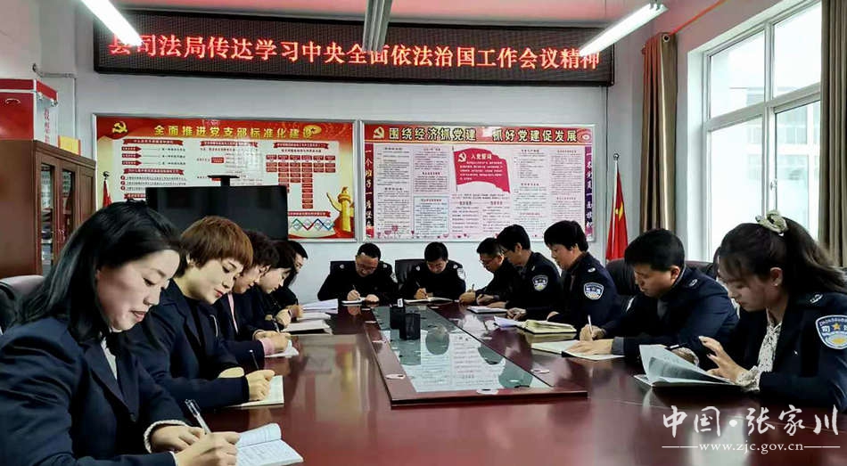 11月26日,张家川县司法局召开专题会议传达学习中央全面依法治国工作会议精神, 局机关、公证、律师事务所全体干部职工参加了学习会议。