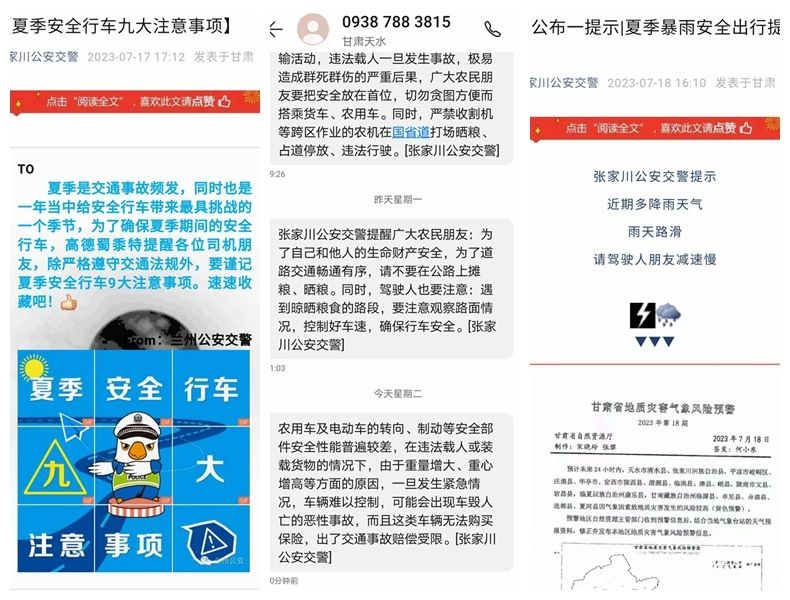 充分依托“双微一端”、12123交管平台等媒介,应对夏季雨雾恶劣天气、重要节假、周末等特殊节点,及时对外发布“两公布一提示”交通路况信息,提前向社会公布辖区危险路段和事故多发点段,提醒广大群众合理选择出行方式、时间及路线,错峰出行。借助执勤执法活动契机对过往车辆驾驶人开展“滴灌式”宣传教育,切实增强驾驶人交通安全意识,增强群众遵守道路交通法律法规的自觉性。结合“七进”、“美丽乡村行”等宣传活动,组织专人通过发放交通安全宣传材料、播放警示教育片、主题讲课等方式,多角度、全方位向广大群众积极宣传超速、超员、疲劳驾驶和酒后驾驶等交通违法行为的严重危害性,引导群众安全文明出行,全面加强辖区道路交通安全管理工作,全力筑牢预防道路交通安全的第一道防线,促进形成全民参与、共管共享的交通安全管理浓厚氛围。