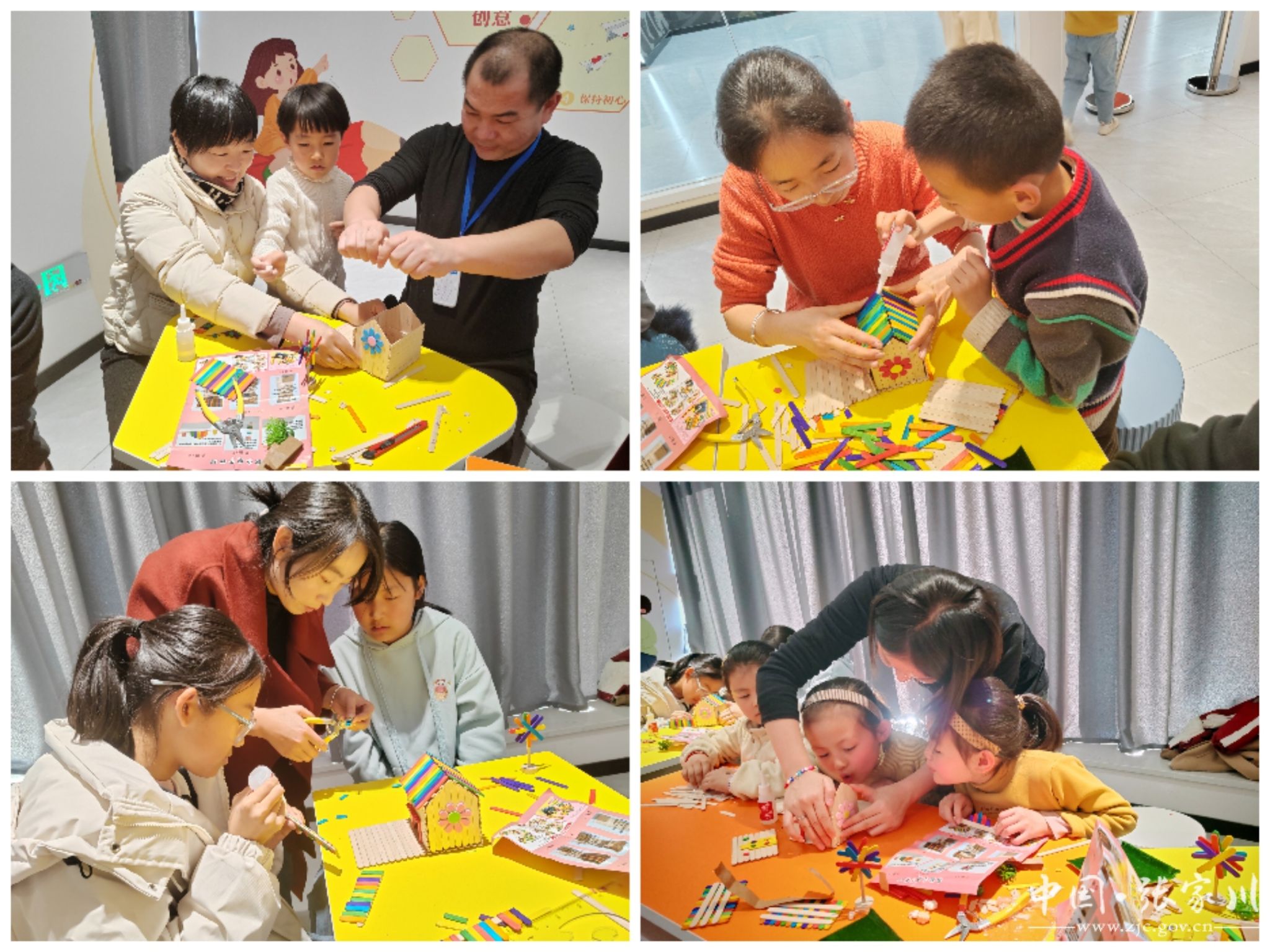 亲子搭建强实践。随后在创意空间展教活动室开展了“共建美丽家园”亲子手工搭建绿色家园活动。孩子们在展教员的指引下,仔细阅读了搭建说明书,并按照搭建步骤仔细操作。小朋友们在家长的帮助下,结合自己的创意,认真将小木条进行修剪、摆放、粘贴。经过两个多小时的搭建,漂亮的七彩房屋就完成了。孩子们手捧着自己的手工创意作品,脸上都流露着满满的喜悦感和自信的成就感。
