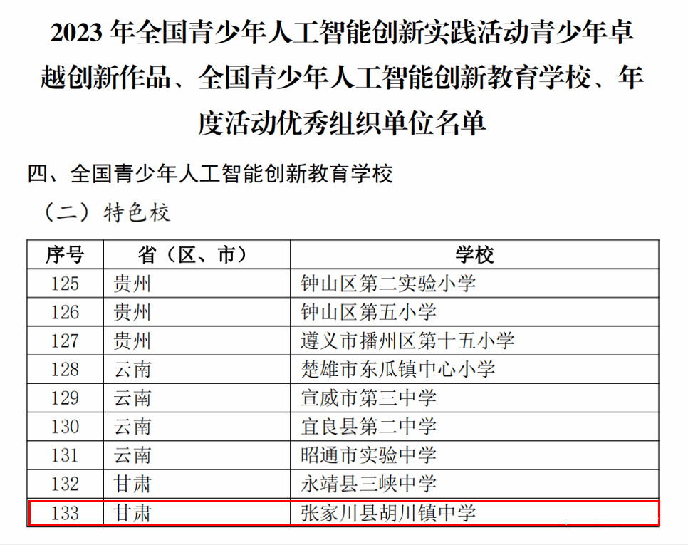 2024年1月23-26日,中国科协青少年科技中心、中国青少年科技教育工作者协会、上海人工智能实验室和上海市科协共同举办2023年全国青少年人工智能创新实践交流展示会。40个青少年优秀作品被评为“五星卓越”创新作品,50个青少年优秀作品被评为“四星卓越”创新作品,参加活动的159所中小学被分别评为全国青少年人工智能创新教育示范校和特色校,10个单位被评为年度活动优秀组织单位,张家川县胡川镇中学在大会上被表彰为“2023年全国青少年人工智能创新教育特色校”。