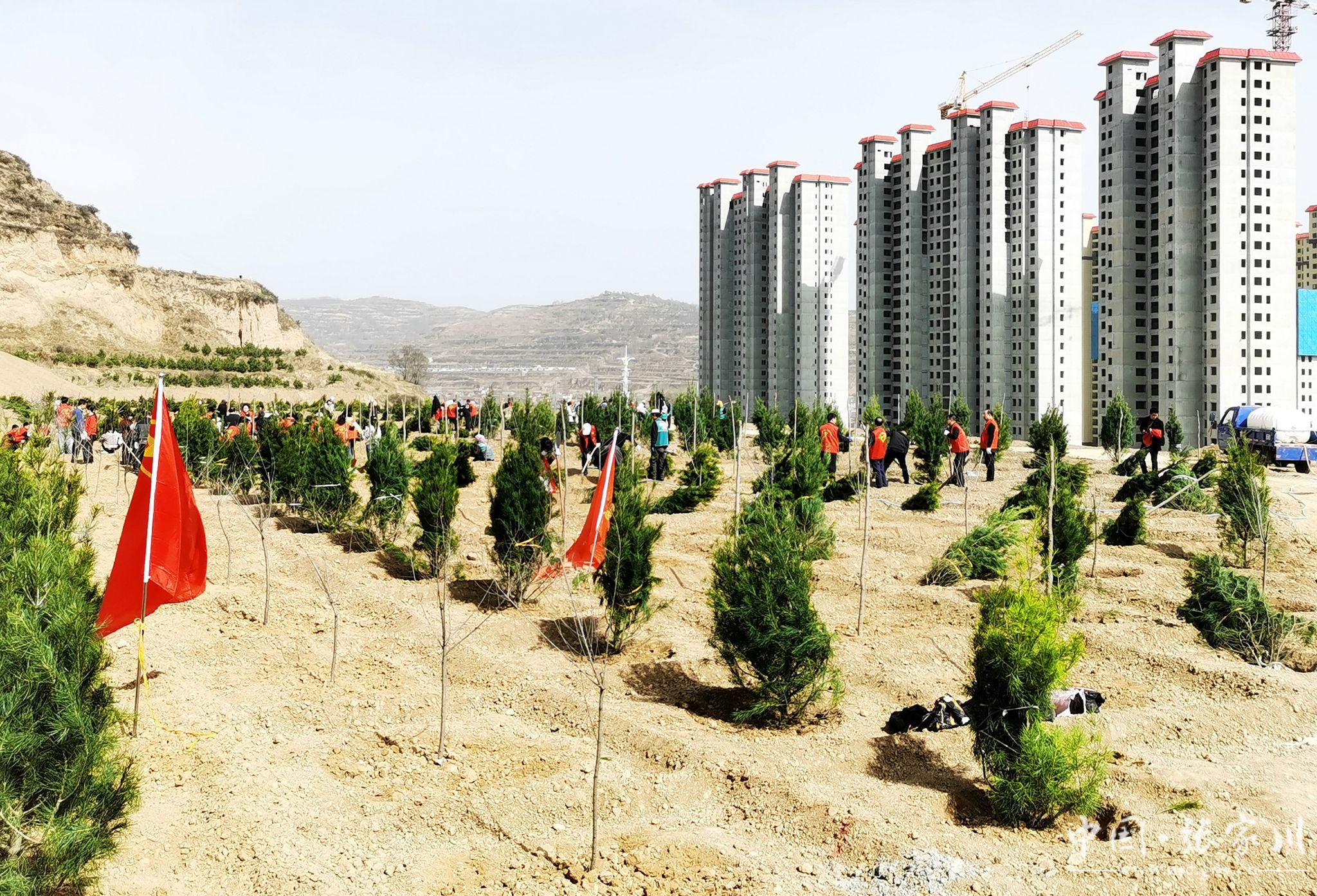 在张家川镇杨川村,不同单位的干部职工分布在不同的山间地头,搬运苗木、培土栽植……大家两人一组、三人一群,分工合作,认真栽下一棵棵树苗。