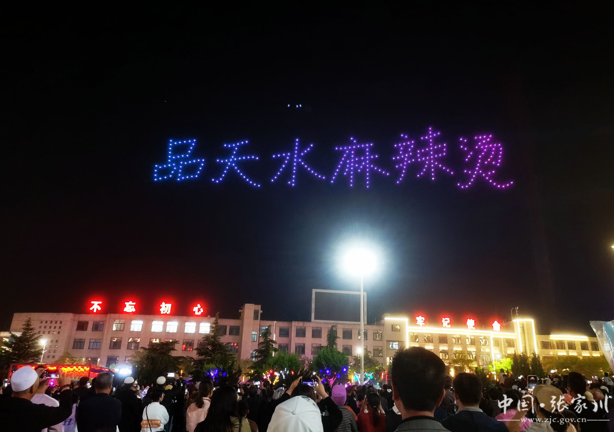 起落交错的队形、魔幻的灯光、雄浑的旋律,一架架无人机好似漫天飞舞的流星,以夜空为画布,以灯光为画笔,在队形变幻与灯光变化中,描绘出一幅幅张家川振兴突破的新画卷。现场瞬间沸腾!大家纷纷举起手机或相机,拍下震撼瞬间,向全国各地的朋友分享展示。