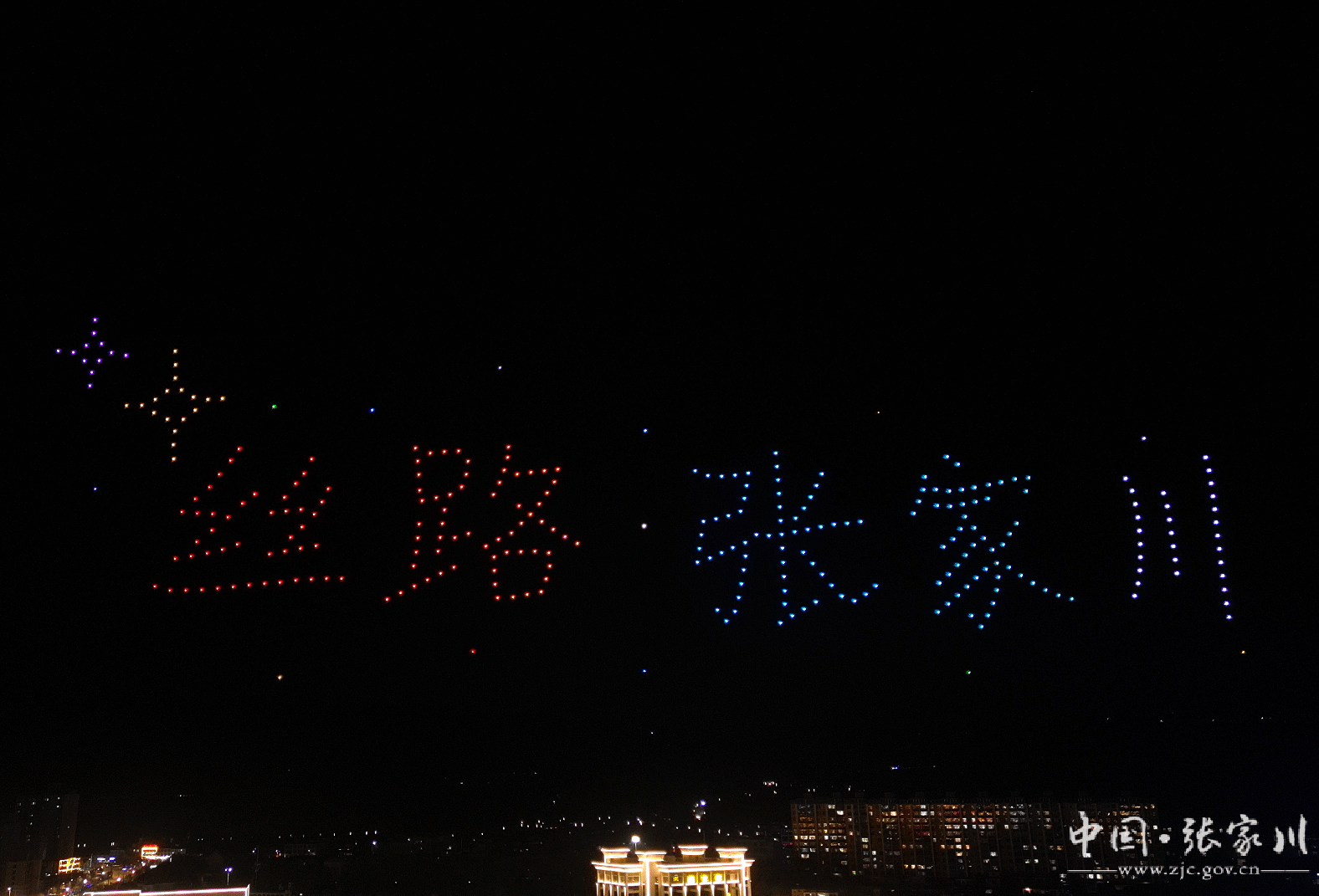 升空后的无人机开始变换阵形,色彩斑斓的灯光变化与张家川的夜景相融交织,让人们感受到了科技与艺术的完美结合。“丝路大关山”、“书香张家川”、“行游关陇古道”、“打卡战国豪车”、“品天水麻辣烫”、“游丝路张家川”、“花儿张家川”、“丝路张家川”等张家川元素随着光影变化,在星空中一一呈现。最后,充满了热情和亲切感的“张家川欢迎您”字样闪耀在夜空中,表达了张家川人民对来自四面八方游客的热烈欢迎。每次光影变换之间,都有新的惊喜,视觉效果拉满!