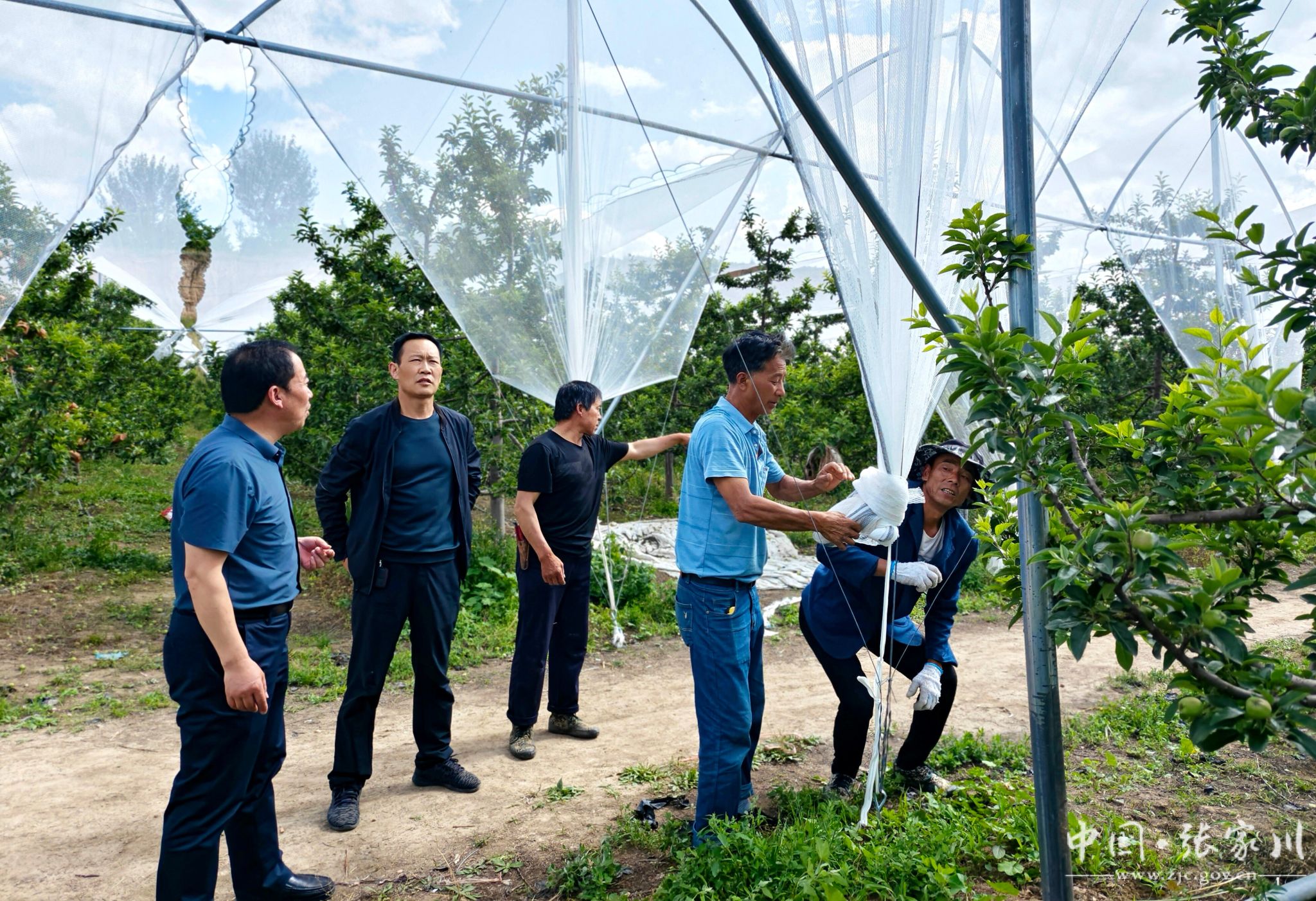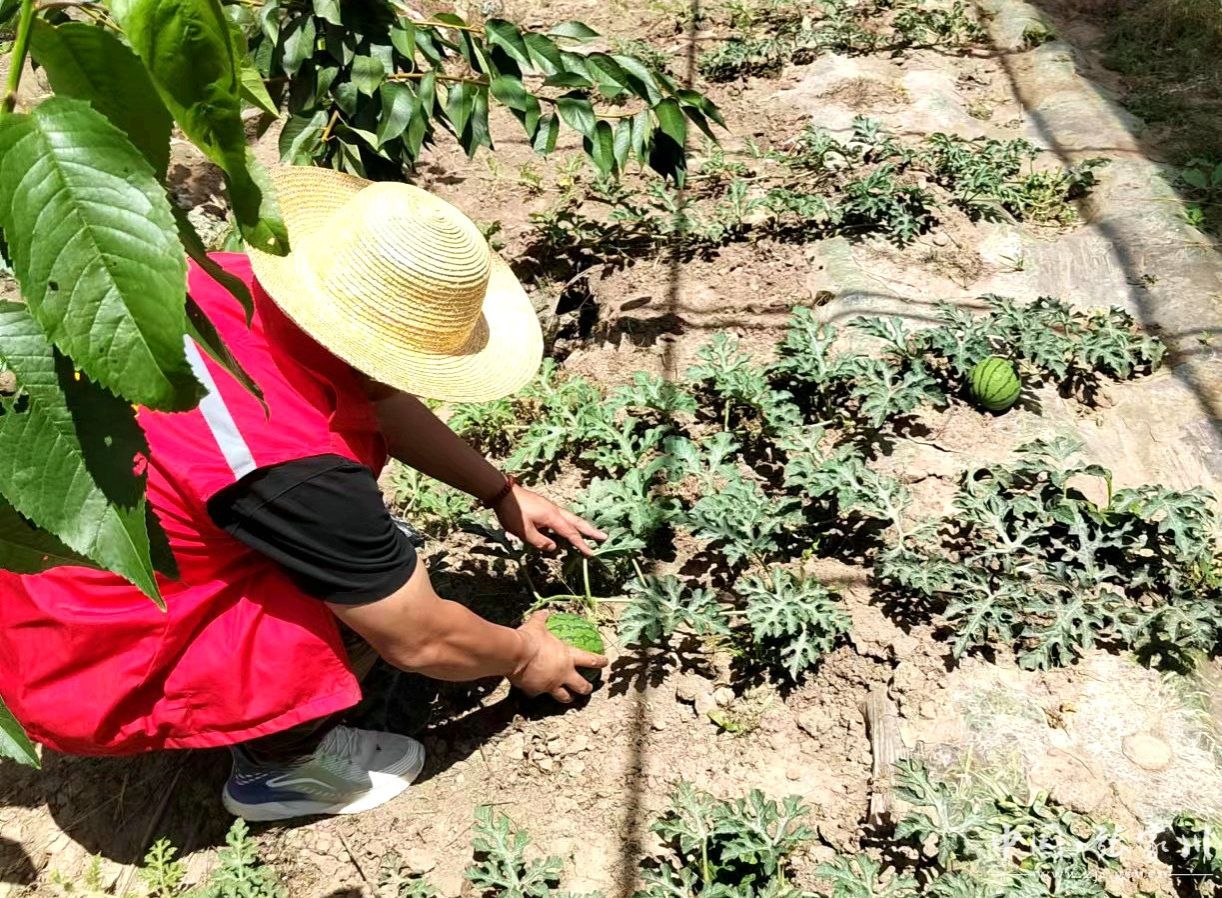 在梁山镇樱桃沟村的西瓜园内,村党支部书记马五平带领种植能手了解西瓜的生长情况,几人仔细查看瓜田,不时从瓜藤上清理出长歪的劣果。在苹果园中,果农们穿梭在树影中,忙着给果树施肥,一派繁忙的景象。夏季气温高,正是各种水果谢花出果的好时候,果园的技术管护也需要比平时更加仔细。