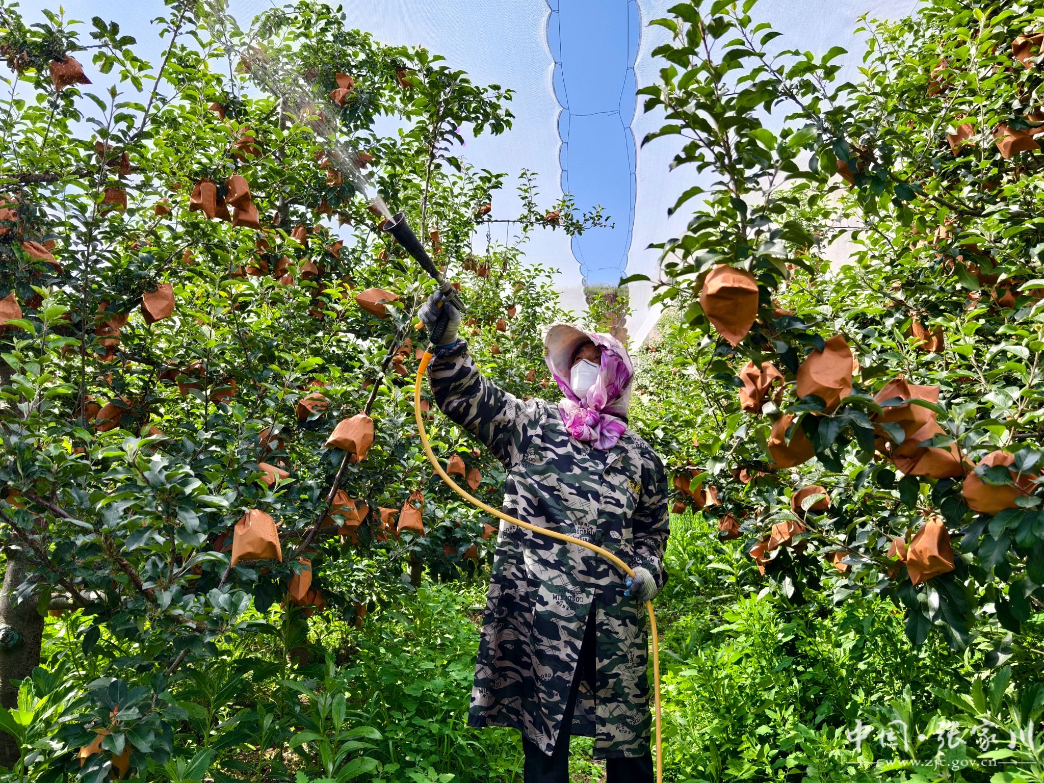 在木河乡庄河村的隆裕家庭农场的苹果园,白色防雹网下数千棵苹果树郁郁葱葱,枝丫上乒乓球般大小的幼果均匀分布,不套袋的花牛苹果青绿喜人,已套袋的富士苹果穿上了土黄色的新衣,果园管护人员正在给果树喷药,以提高果实品质。