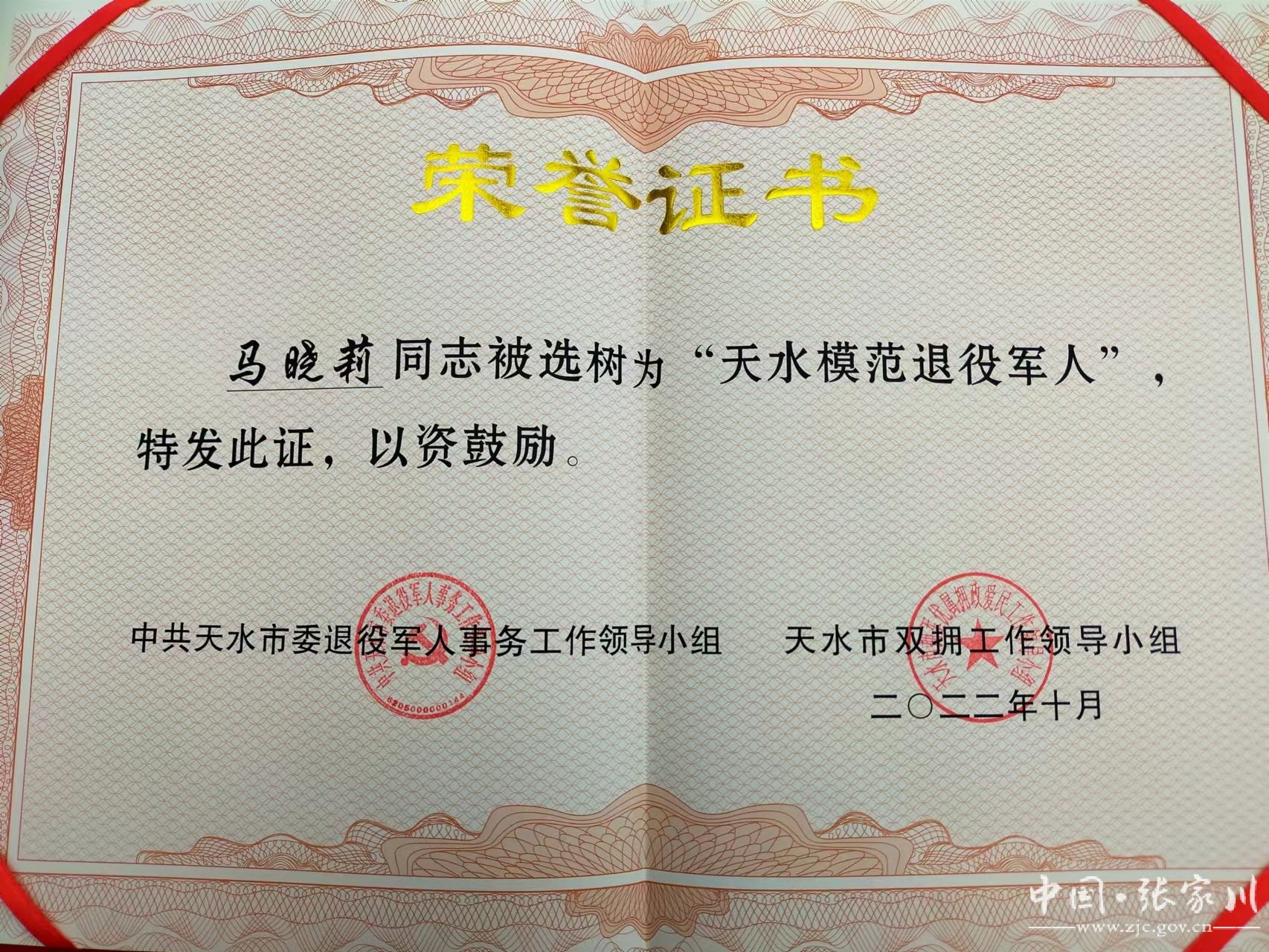 她叫马晓莉,今年51岁,1991年12月入伍,1994年11月加入中国共产党。服役期间,曾获嘉奖2次、学雷锋先进个人1次、优秀士兵2次。1994年12月退伍后被分配到原县工商局工作,现为张家川县市场监督管理局三级主任科员,2022年,获得“天水模范退役军人”称号。